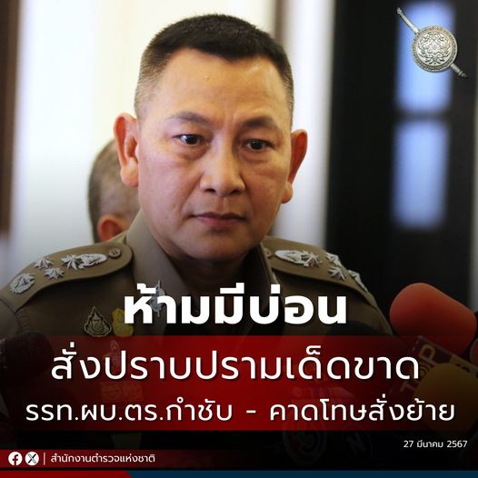 27 มี.ค. 2567 15:49:08รรท.ผบ.ตร.สั่งลงดาบย้าย ผกก.สน.พญาไท หลังกองปราบฯ จับบ่อนพนันให้พื้นที่ พร้อมกำชับเข้มทั่วประเทศ ห้ามมีบ่อน ปราบปรามเด็ดขาด คาดโทษย้ายจริง เมื่อวันที่ 27 มีนาคม 2567 พล.ต.อ.กิตติ์รัฐ พันธุ์เพ็ชร์ รองผู้บัญชาการตำรวจแห่งชาติ รักษาราชการแทนผู้บัญชาการตำรวจแห่งชาติ (รรท.ผบ.ตร.) สั่งการกำชับตำรวจทุกพื้น...