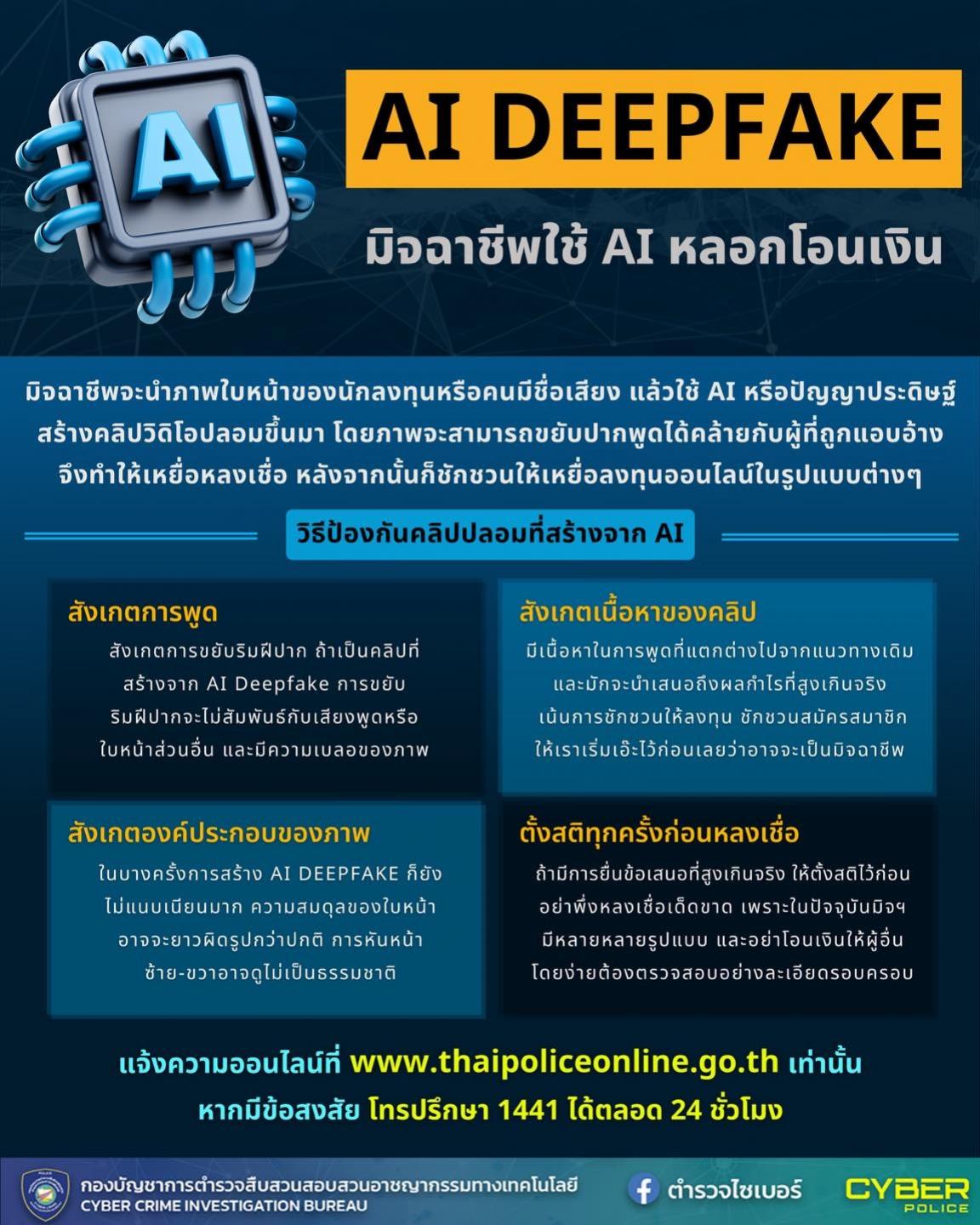 27 มี.ค. 2567 15:54:06🚨 ตำรวจไซเบอร์เตือนภัย ⚠️ มิจฉาชีพใช้ AI DEEPFAKE หลอกให้โอนเงิน . 📌มิจฉาชีพจะนำภาพใบหน้าของนักลงทุนหรือคนมีชื่อเสียง แล้วใช้ AI หรือปัญญาประดิษฐ์ สร้างคลิปวิดิโอปลอมขึ้นมา โดยภาพจะสามารถขยับปากพูดได้คล้ายกับผู้ที่ถูกแอบอ้าง จึงทำให้เหยื่อหลงเชื่อ หลังจากนั้นก็ชักชวนให้เหยื่อลงทุนออนไลน์ในรูปแบบต่าง...
