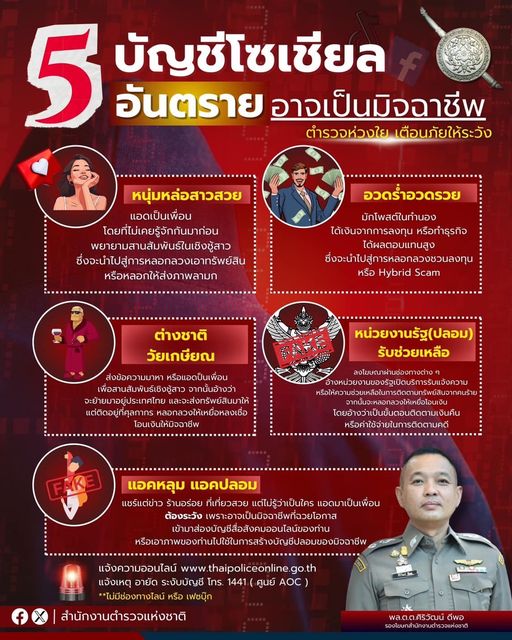 15 มี.ค. 2567 11:12:03🚨ระวัง 5 บัญชีโซเชียลอันตราย แนะ ไม่รับแอด ไม่คุยแชต ไม่โอนเงิน . พล.ต.ต.ศิริวัฒน์ ดีพอ รองโฆษกสำนักงานตำรวจแห่งชาติ เปิดเผยว่า พล.ต.อ.ต่อศักดิ์ สุขวิมล ผบ.ตร. ได้มีความห่วงใยพี่น้องประชาชนที่อาจได้รับความเสียหายจากอาชญากรรมรูปแบบต่าง ๆ ซึ่งในปัจจุบันกลุ่มมิจฉาชีพยังคงมีการพัฒนารูปแบบในการหลอกลวงพี่...