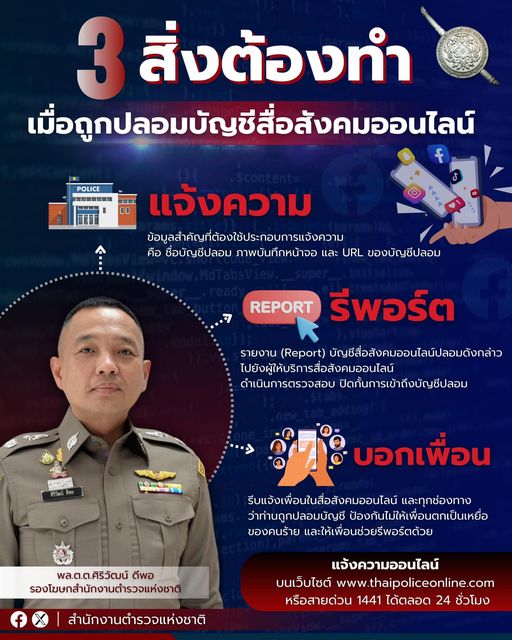 1 ธ.ค. 2566 12:20:40📣 3 สิ่งที่ต้องทำ เมื่อถูกปลอมบัญชีสื่อสังคมออนไลน์ “แจ้งความ รีพอร์ต บอกเพื่อน” 🚨 . พล.ต.ต.ศิริวัฒน์ ดีพอ รองโฆษกสำนักงานตำรวจแห่งชาติ เปิดเผยว่า “พล.ต.อ.ต่อศักดิ์ สุขวิมล ผบ.ตร.” มีความห่วงใยพี่น้องประชาชนที่อาจได้รับความเสียหายจากอาชญากรรมรูปแบบต่าง ๆ ซึ่งในปัจจุบันมีพี่น้องประชาชนจำนวนมากที่ได้ร...