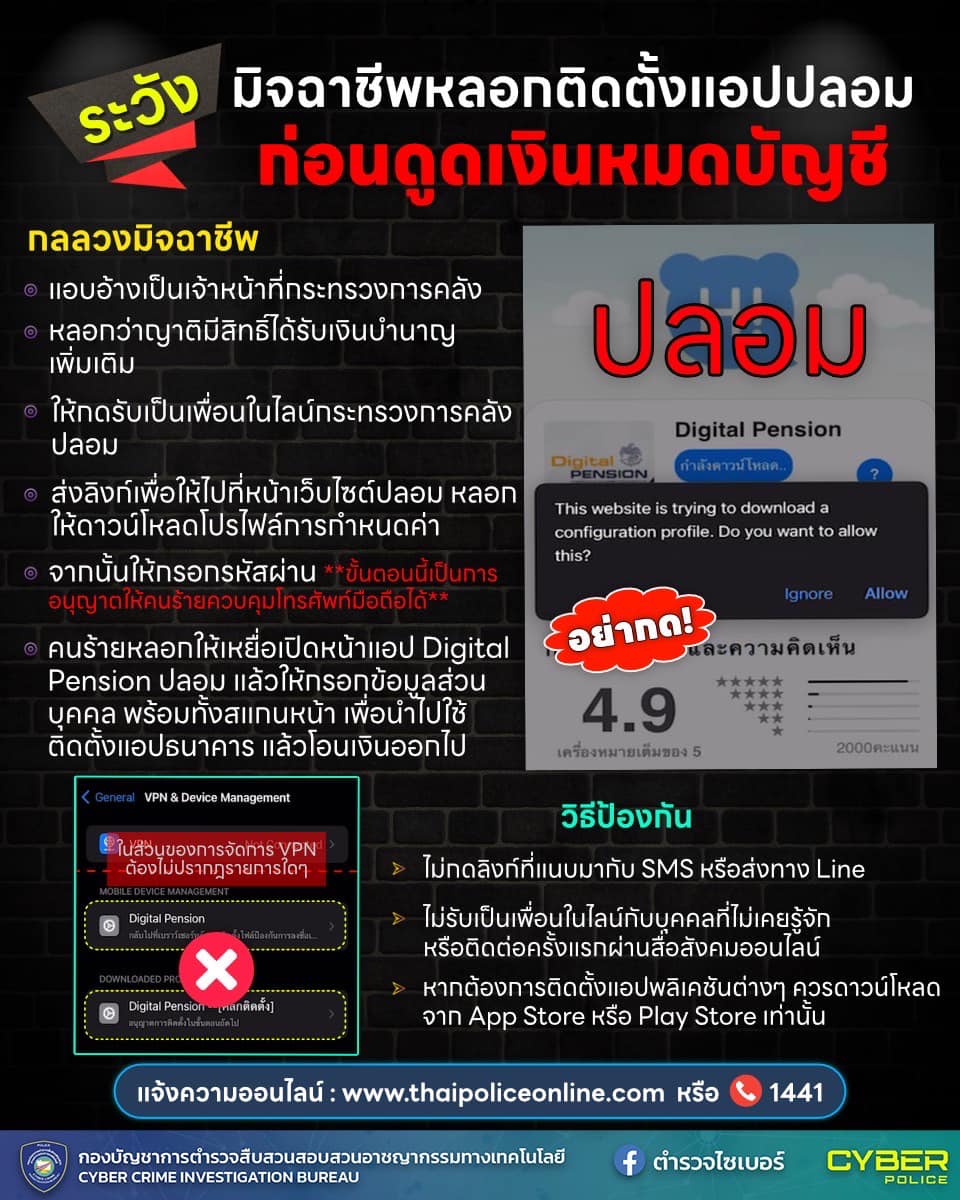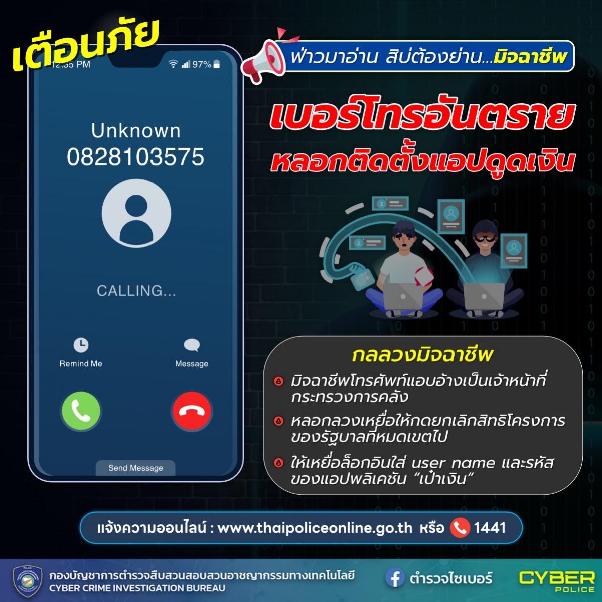 15 ธ.ค. 2566 09:26:48ฟ่าวมาอ่าน สิบ่ต้องย่านมิจฉาชีพ❗️ ตำรวจไซเบอร์เตือนภัยเบอร์แปลก หลอกติดตั้งแอปดูดเงิน . ช่วงนี้มีข่าวเบอร์โทรอันตราย 082-810-3575 อ้างเป็นเจ้าหน้าที่รัฐ โทรหลอกให้เหยื่อล็อกอิน ใส่ Username และ รหัสผ่านของแอปชื่อ "เป๋าเงิน" จนโดนดูดเงินออกจากบัญชีธนาคาร . ตำรวจไซเบอร์จึงฟ่าวมาเตือนภัย แนะนำวิธีการรั...