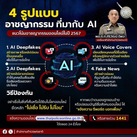 20 ธ.ค. 2566 16:43:354 รูปแบบอาชญากรรมออนไลน์ที่ต้องจับตามองในปี 2567 เมื่อ AI ถูกใช้ในด้านมืด ปลอมได้สารพัด . เมื่อวันที่ 19 ธันวาคม 2566 พล.ต.ต.ศิริวัฒน์ ดีพอ รองโฆษกสำนักงานตำรวจแห่งชาติ เปิดเผยว่า พล.ต.อ.ต่อศักดิ์ สุขวิมล ผบ.ตร. มีความห่วงใยพี่น้องประชาชนที่อาจได้รับความเสียหายจากอาชญากรรมรูปแบบต่าง ๆ . จากสถิติการ...