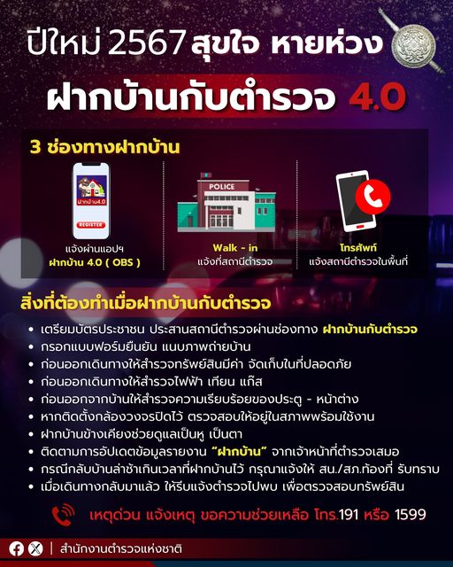 26 ธ.ค. 2566 14:38:11เริ่มแล้ว‼️ ฝากบ้านกับตำรวจ 4.0 ปีใหม่ 2567 สุขใจ หายห่วง ฝากบ้านไว้ให้ตำรวจช่วยดูแล 3 ช่องทางฝากบ้านกับตำรวจ 📱แจ้งผ่านแอปพลิเคชัน ฝากบ้าน 4.0 ( OBS ) 🚓วอล์กอินเข้าแจ้งที่สถานีตำรวจ 🚨โทรศัพท์แจ้งสถานีตำรวจในพื้นที่ . สิ่งที่ท่านต้องเตรียมพร้อม เมื่อฝากบ้านกับตำรวจ - เตรียมบัตรประชาชน ประสานสถานีตำ...