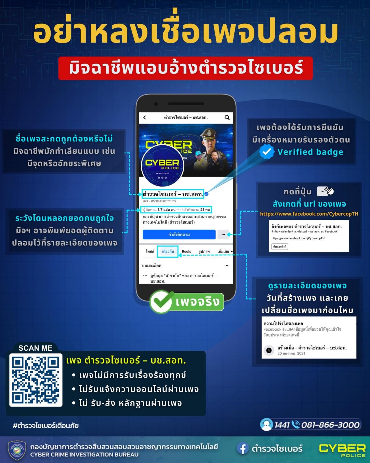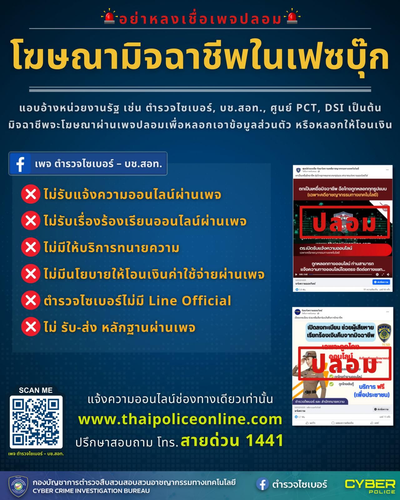 13 พ.ย. 2566 14:09:31🚨ตำรวจไซเบอร์เตือนภัย🚨 📢อย่าหลงเชื่อเพจปลอม มิจฉาชีพแอบอ้างตำรวจไซเบอร์ . . ✅หากประชาชนได้รับความเสียหายหรือถูกหลอกลวงในคดีอาชญากรรมทางเทคโนโลยี สามารถแจ้งความออนไลน์ได้ที่เว็บไซต์นี้ https://thaipoliceonline.com เท่านั้น!! . ✅ติดตามข้อมูลข่าวสาร เพจ ตำรวจไซเบอร์ – บช.สอท. ต้อง URLนี้ : https://www....