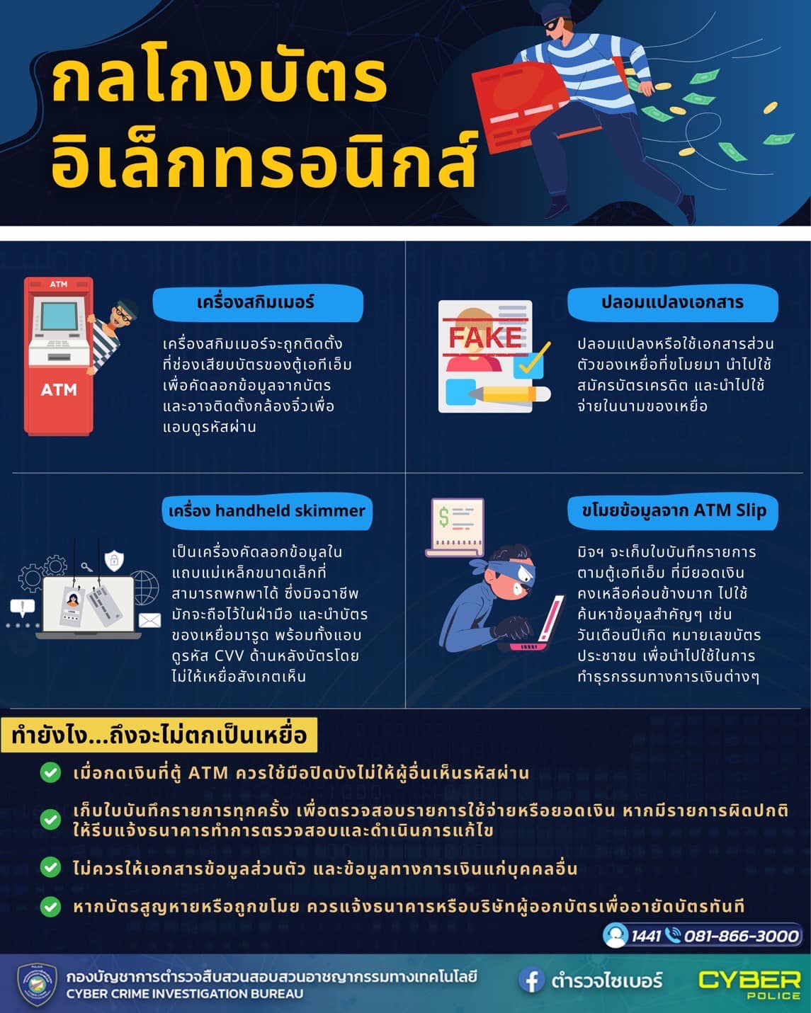 24 ต.ค. 2566 08:56:36🚨ตำรวจไซเบอร์เตือนภัย🚨 . 📱 รู้ทันกลโกงบัตรอิเล็กทรอนิกส์ . 1. เครื่องสกิมเมอร์ : จะถูกติดตั้งที่ช่องเสียบบัตรของตู้เอทีเอ็มเพื่อคัดลอกข้อมูลจากบัตร และอาจติดตั้งกล้องจิ๋วเพื่อแอบดูรหัสผ่าน 2. ปลอมแปลงเอกสาร : ปลอมแปลงหรือใช้เอกสารส่วนตัวของเหยื่อที่ขโมยมา นำไปใช้สมัครบัตรเครดิต และนำไปใช้จ่ายในนามขอ...