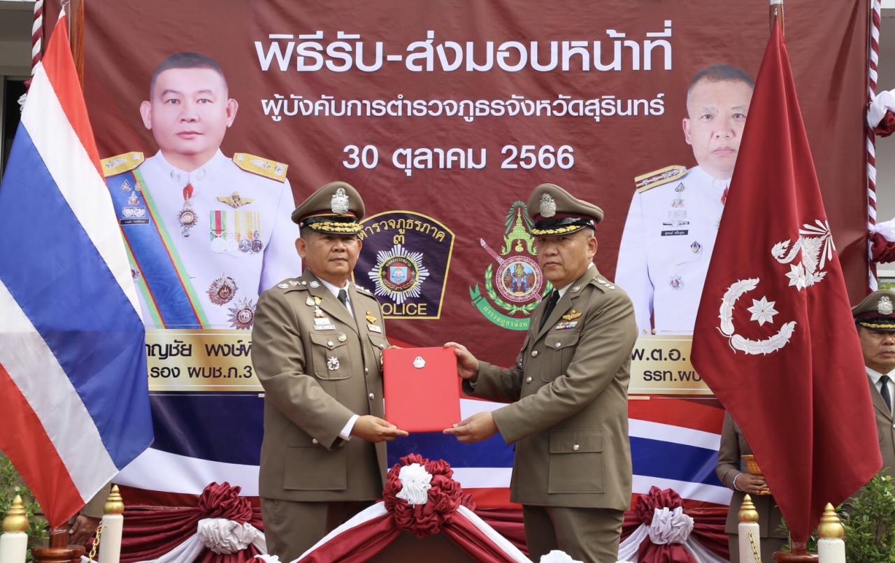 30 ต.ค. 2566 18:33:02 พิธีรับ-ส่งมอบหน้าที่ ผบก.ภ.จว.สุรินทร์ วันนี้ (30 ต.ค. 66) เวลา 09.09 น. พล.ต.ต.ชาญชัย พงษ์พิชิตกุล รรท.รอง ผบช.ภ.3 และ พ.ต.อ.สุคนธ์ ศรีอรุณ รอง ผบก.สส.ภ.3 รรท.ผบก.ภ.จว.สุรินทร์ ร่วมพิธีรับ-ส่งมอบหน้าที่ ผบก.ภ.จว.สุรินทร์ โดยมี พ.ต.อ.สุจริต ปาณเล็ก รอง ผบก.ฯ, พ.ต.อ.ศิราเมษฐ์ ธานินพิท...