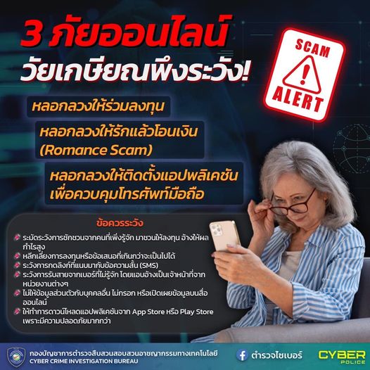 10 ต.ค. 2566 09:33:35🚨ตำรวจไซเบอร์เตือนภัย🚨 . 📱3 ภัยออนไลน์ วัยเกษียณพึงระวัง! . ในช่วงเดือนกันยายนของทุกปี ถือเป็นเวลาเกษียณอายุราชการของใครหลายคน ซึ่งกลุ่มมิจฉาชีพจะใช้โอกาสในช่วงนี้หลอกลวง หรือหาผลประโยชน์จนเกิดความเสียหายกับเหยื่อได้ ซึ่งจากสถิติพบว่า มี 3 เรื่อง ที่มิจฉาชีพหลอกลวงเอาทรัพย์สินจากประชาชน ได้แก่ 1️⃣ห...