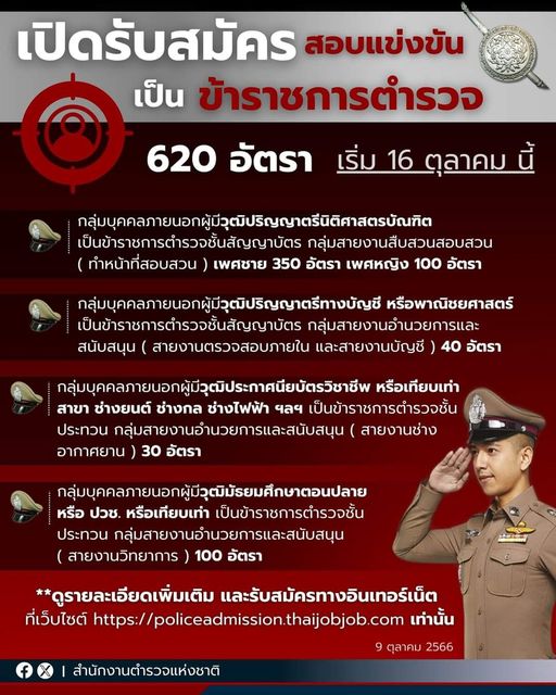 10 ต.ค. 2566 09:37:25สำนักงานตำรวจแห่งชาติ โดย #กองการสอบ กองบัญชาการศึกษา เปิดรับสมัครบุคคลภายนอก สอบแข่งขัน เพื่อสอบบรรจุแต่งตั้งเป็นข้าราชการตำรวจชั้นสัญญาบัตร และชั้นประทวน สายงานต่าง ๆ รวม 620 อัตรา 📍สามารถตรวจสอบรายละเอียดเพิ่มเติม และสมัครทางอินเทอร์เน็ต ที่ https://policeadmission.thaijobjob.com เท่านั้น ...