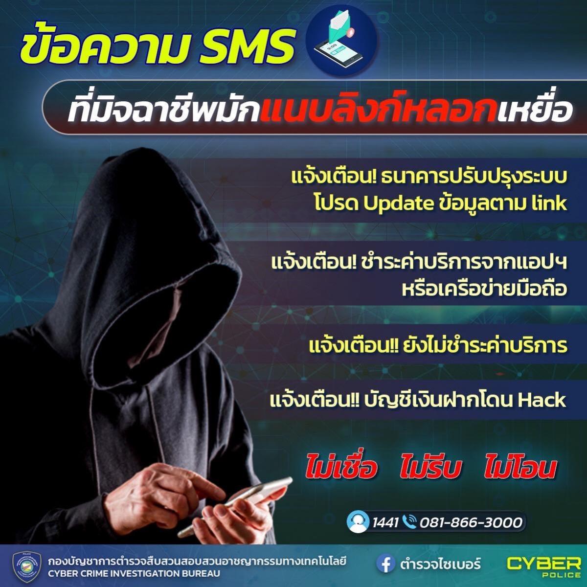 11 ก.ย. 2566 09:37:52🚨ตำรวจไซเบอร์เตือนภัย🚨 . 📨ข้อความ SMS ที่มิจฉาชีพมักแนบลิงก์หลอกเหยื่อ . กลลวงจากมิจฉาชีพมักจะอ้างตัวเป็นเจ้าหน้าที่รัฐ หรือหน่วยงานต่างๆ และมักจะส่งข้อความ SMS แนบลิงก์ที่เชิญชวนให้ผู้เสียหายคลิกลิงก์ โดยข้อความที่นิยมมีดังนี้ 🔸แจ้งเตือน!! ธนาคารปรับปรุงระบบ โปรด update ข้อมูลตาม link 🔸แจ้งเตือน!! ...
