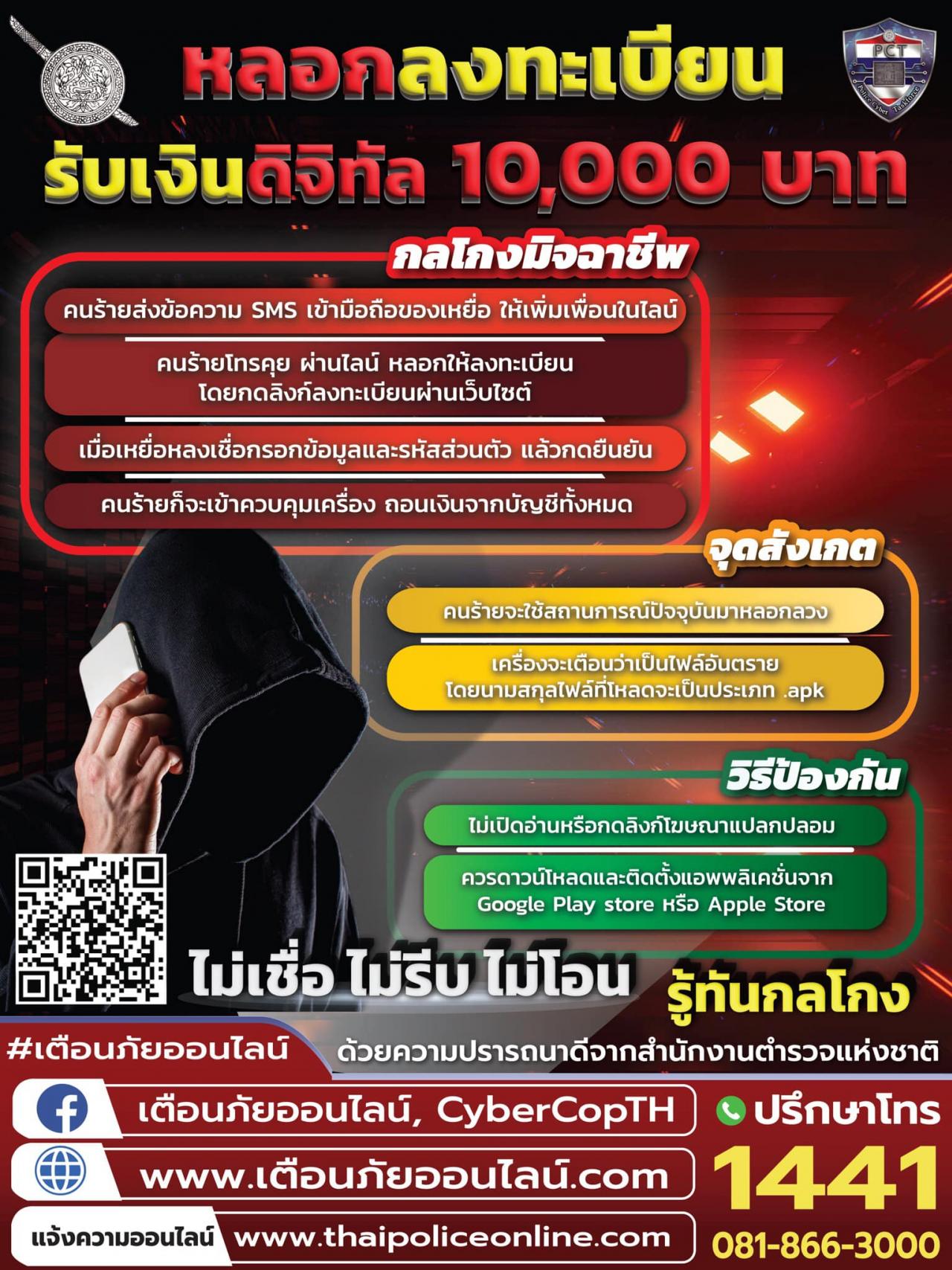 4 ก.ย. 2566 09:10:16👮🏻♀️ตำรวจไซเบอร์เตือนภัย 📢หลอกลงทะเบียนรับเงินดิจิทัล 10,000 บาท 👉กลโกงของคนร้าย : 1.คนร้ายส่ง SMS เข้ามือถือของเหยื่อ เมื่อเหยื่อกดลิงก์เข้าไป จะเป็นการให้เพิ่มเพื่อนในไลน์ 2.คนร้ายโทรคุยผ่านไลน์ โดยหลอกให้ลงทะเบียนผ่านเว็บไซต์ 3.เหยื่อหลงเชื่อกรอกข้อมูล และกดยอมรับให้เข้าถึงอุปกรณ์ 4.คนร้ายเข้าค...