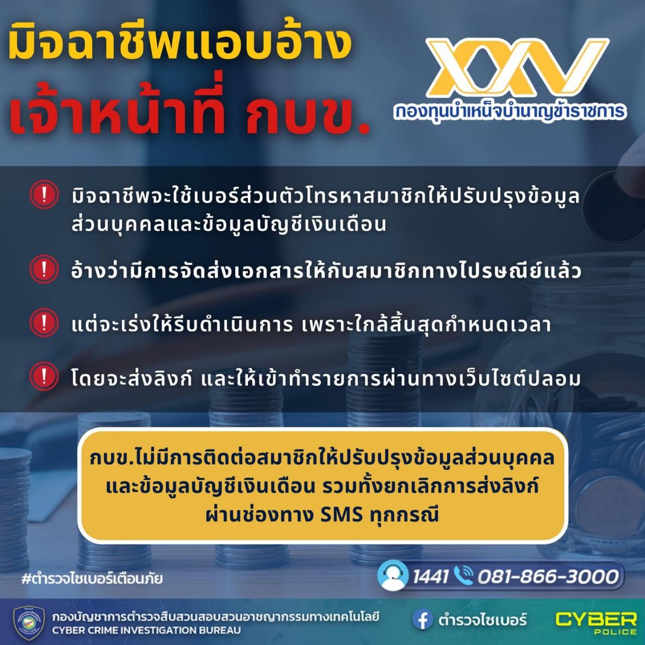 11 ก.ย. 2566 09:36:55👮🏻♀️ตำรวจไซเบอร์เตือนภัย 📢มิจฉาชีพแอบอ้างว่าเป็นเจ้าหน้าที่ กบข. . 📌กลโกงของคนร้าย : 1. มิจฉาชีพจะใช้เบอร์ส่วนตัวโทรหาสมาชิกให้ปรับปรุงข้อมูล ส่วนบุคคลและข้อมูลบัญชีเงินเดือน 2. อ้างว่ามีการจัดส่งเอกสารให้กับสมาชิกทางไปรษณีย์แล้ว 3. แต่จะเร่งให้สมาชิกต้องรีบดำเนินการ เพราะใกล้สิ้นสุดกำหนดเวลา 4. โด...
