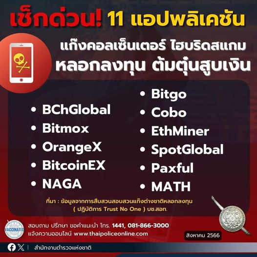 25 ส.ค. 2566 12:35:36🚨เช็กด่วน! เคยลงทุนเงินดิจิทัล เทรดทอง เทรดเหรียญ ใน 11 แอปพลิเคชัน เหล่านี้หรือไม่ . หากท่านมีผู้ชักชวนลงทุน เก็งกำไรสินทรัพย์ดิจิทัลในแอปพลิเคชันเหล่านี้ โปรดระวัง ตรวจสอบโดยด่วน ท่านอาจกำลังตกเป็นเหยื่อมิจฉาชีพ!? . รีบแจ้งมายังสายด่วน ตำรวจไซเบอร์ ( บช.สอท.) โทร.1441 . เนื่องจากตำรวจไซเบอร์ เปิ...