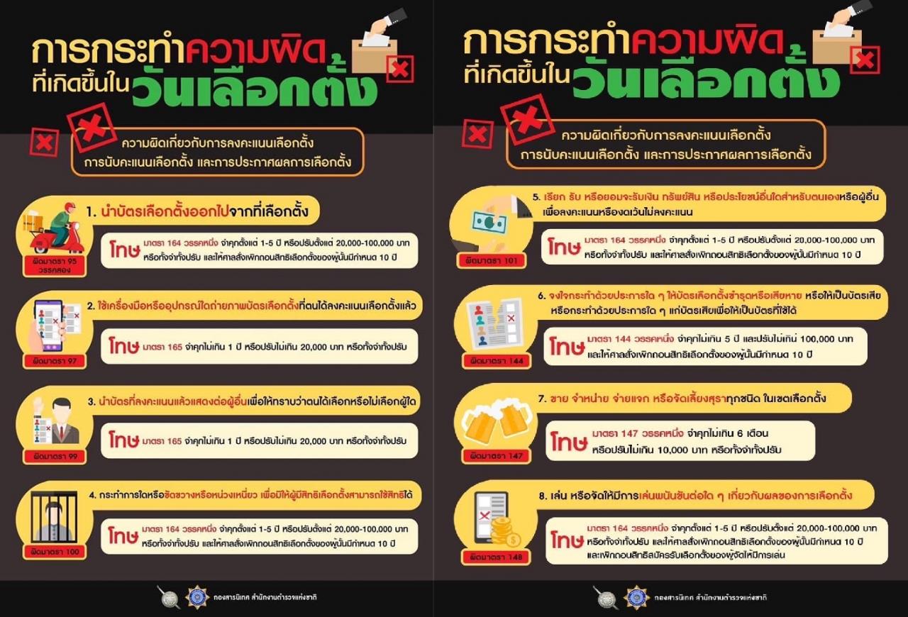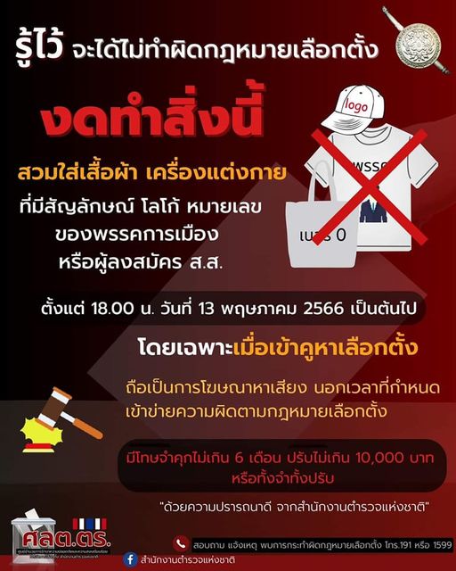 12 พ.ค. 2566 17:05:14ศลต.ตร.ย้ำเตือนประชาชน งดสวมใส่เสื้อผ้า เครื่องแต่งกาย มีสัญลักษณ์พรรคการเมือง - ผู้สมัคร เข้าคูหาเลือกตั้ง . วันนี้ (10 พฤษภาคม 2566) พล.ต.ท.นิธิธร จินตกานนท์ ผู้บัญชาการประจำสำนักงาน ผบ.ตร. ในฐานะโฆษก ศูนย์อำนวยการรักษาความปลอดภัยและความสงบเรียบร้อยการจัดการเลือกตั้ง สำนักงานตำรวจแห่งชาติศลต.ตร. ...