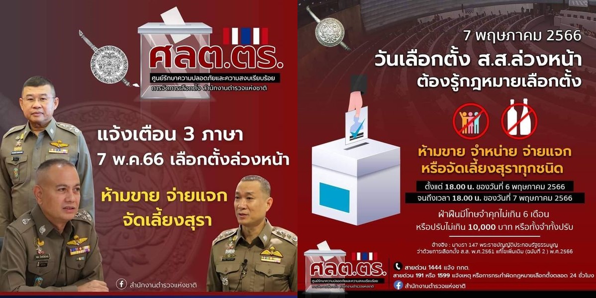 3 พ.ค. 2566 10:19:49แจ้งเตือน!!! 7 พ.ค.นี้ ✅ เลือกตั้ง ส.ส.ล่วงหน้า ❌ ห้ามจำหน่าย จ่ายแจก จัดเลี้ยงสุรา ทั่วประเทศ ❌ . เมื่อวันที่ 2 พฤษภาคม 2566 พล.ต.ท.นิธิธร จินตกานนท์ โฆษกศูนย์อำนวยการรักษาความปลอดภัยและความสงบเรียบร้อยการจัดการเลือกตั้ง สำนักงานตำรวจแห่งชาติ (ศลต.ตร.) ภ กล่าวด้วยว่า ศลต.ตร.ขอประชาสัมพันธ์พี่น้องป...