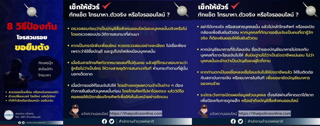 3 พ.ค. 2566 10:25:44เตือนภัย! โจรออนไลน์ สวมรอยเป็นเพื่อน คนในครอบครัว หรือคนรู้จัก ส่งข้อความ - โทรศัพท์มา "ขอยืมเงิน" . ตั้งแต่ 1 มีนาคม 2565 เป็นต้นมาถึงปัจจุบัน ( 2 พฤษภาคม 2566 ) มีผู้ตกเป็นเหยื่อ แล้วแจ้งความออนไลน์กว่า 8,500 ราย มูลค่าความเสียหาย มากกว่า 300 ล้านบาท สำนักงานตำรวจแห่งชาติได้ดำเนินการสืบสวน สอบสวน...