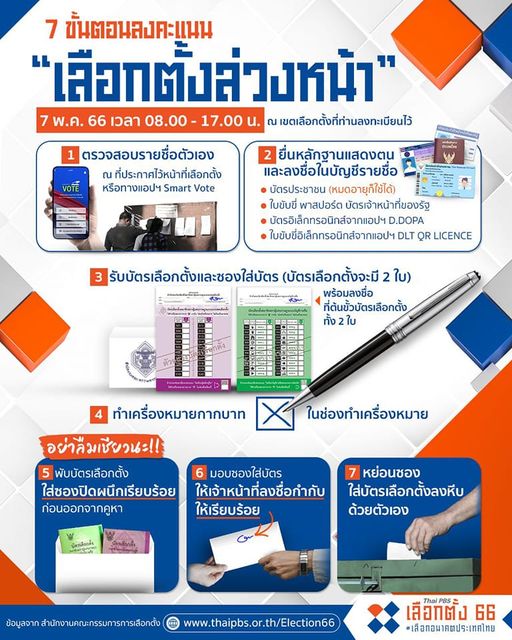 6 พ.ค. 2566 13:55:397 พฤษภาคม #เลือกตั้งล่วงหน้า . กกต. ย้ำประชาชนที่ลงทะเบียนขอใช้สิทธิเลือกตั้งล่วงหน้าในวันที่ 7 พฤษภาคม จะต้องไปใช้เสร็จในวันดังกล่าวเท่านั้น ไม่สามารถไปใช้สิทธิได้ในวันที่ 14 พฤษภาคม . หากไม่ได้ไปใช้สิทธิในวันที่ 7 พฤษภาคม จะต้องแจ้งเหตุที่ไม่อาจไปใช้สิทธิเลือกตั้งได้ตามช่องทางตามกฎหมาย หรือแอพลิเ...