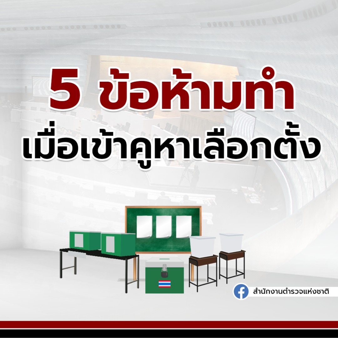 6 พ.ค. 2566 14:01:035 ข้อห้ามทำ เมื่อเข้าคูหาเลือกตั้ง ศลต.ตร.เตือน ผู้ใช้สิทธิเลือกตั้งล่วงหน้า ระมัดระวังการกระทำเข้าข่ายผิดกฎหมาย . เมื่อวันที่ 5 พฤษภาคม 2566 ที่สำนักงานตำรวจแห่งชาติ (ตร.) พล.ต.อ.ดำรงศักดิ์ กิตติประภัสร์ ผู้บัญชาการตำรวจแห่งชาติ (ผบ.ตร.) มอบหมาย ศูนย์อำนวยการรักษาความปลอดภัยและความสงบเรียบร้อยการ...
