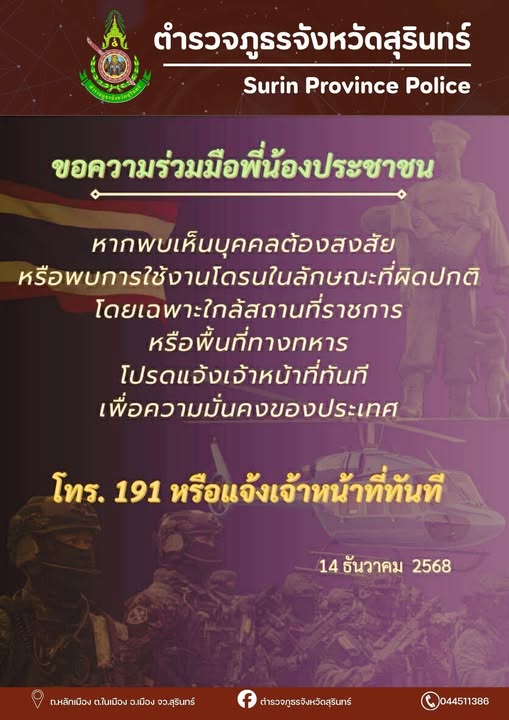 21 ธ.ค. 2568 21:05:46 ลงพื้นที่ให้ความช่วยเหลือประชาชนและผู้อพยพที่ได้รับผลกระทบจากสถานการณ์ความไม่สงบบริเวณชายแดน วันที่ 19 ธ.ค.68 เวลา 13.00 น. พล.ต.ต.สุคนธ์ ศรีอรุณ ผบก.ภ.จว.สุรินทร์, พ.ต.อ.ชัยณรงค์ บุญด้วง รอง ผบก.ภ.จว.สุรินทร์, พ.ต.อ.นพดล ช่วยบุญ ผกก.สภ.ศีขรภูมิ, พ.ต.ท.ชัยรุตน์ สมานรัตน์ รอง ผกก.ป.สภ.ศีขรภูมิ ,...