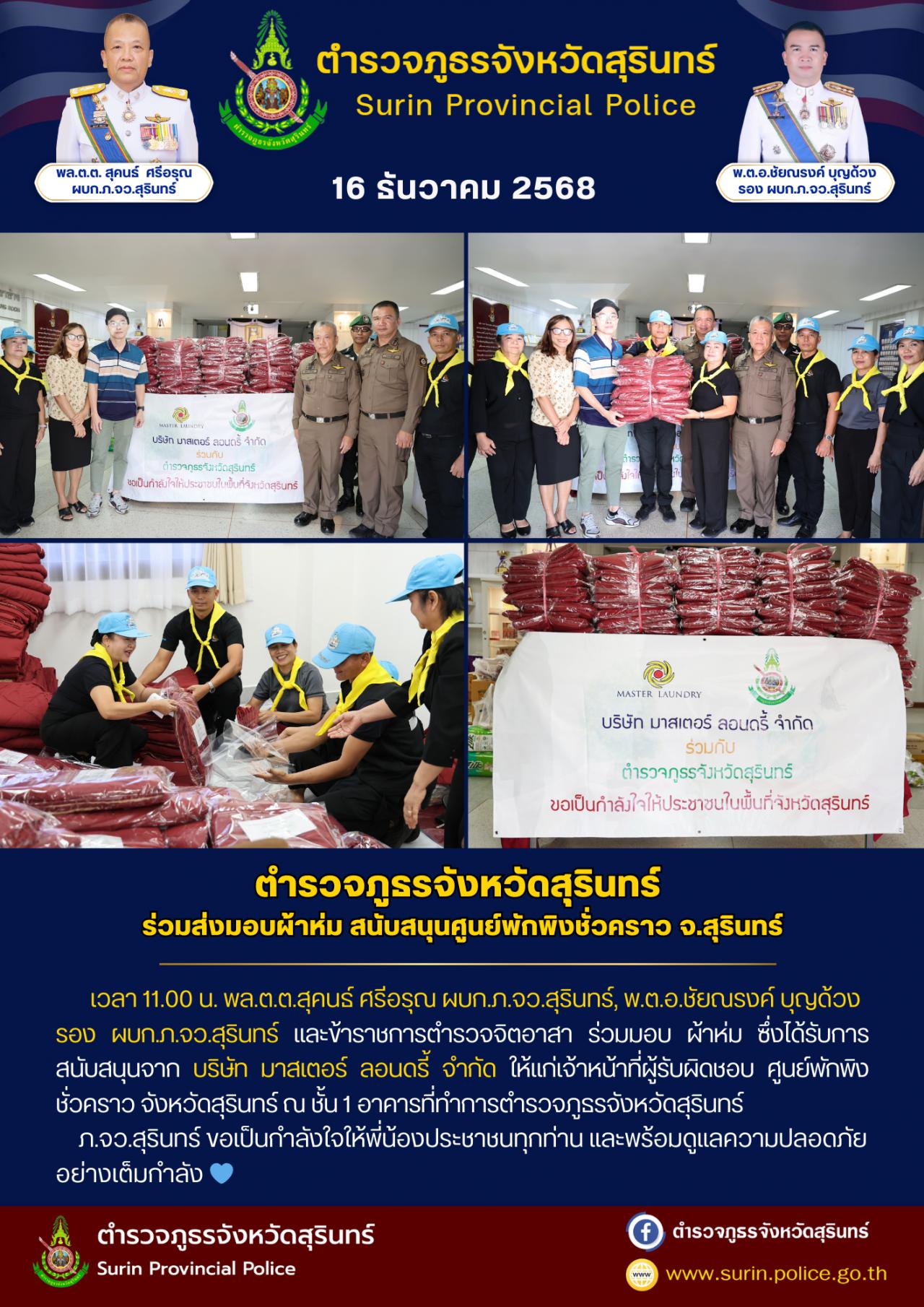 16 ธ.ค. 2568 22:04:57 ร่วมมอบผ้าห่มซึ่งได้รับการสนับสนุนจากบริษัท มาสเตอร์ ลอนดรี้ จำกัด ให้กับเจ้าหน้าที่ศูนย์พักพิงชั่วคราว วันนี้ (16 ธ.ค. 68) เวลา 11.00 น. พล.ต.ต.สุคนธ์ ศรีอรุณ ผบก.ภ.จว.สุรินทร์, พ.ต.อ.ชัยณรงค์ บุญด้วง รอง ผบก.ภ.จว.สุรินทร์ พร้อมด้วยข้าราชการตำรวจจิตอาสา ร่วมมอบผ้าห่มซึ่งได้รับการสนับสนุนจากบริษัท...