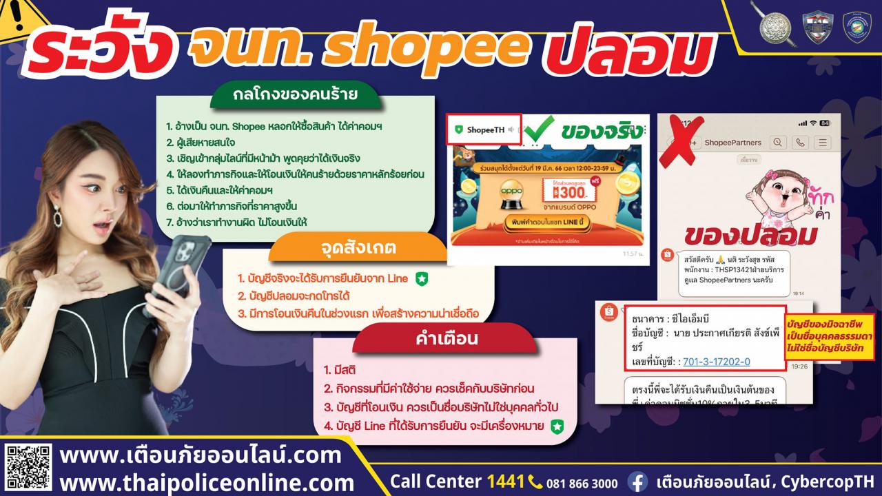 11 เม.ย. 2566 11:14:36👮🏻♀️ตำรวจไซเบอร์เตือนภัย 📢 ระวัง จนท. Shopee ปลอม 👉กลโกงของคนร้าย : 1. ผู้เสียหายเห็นโฆษณาหางานจากใน Facebook จึงสอบถามรายละเอียด 2. คนร้ายให้ผู้เสียหายแอดไลน์ที่ปลอมเป็นเจ้าหน้าที่ shopee จากนั้นจึงดึงผู้เสียหายเข้ากลุ่มไลน์ทำงานที่มี สมาชิกในกลุ่มจำนวนหนึ่งเพื่อสร้างความน่าเชื่อถือ โดยในกลุ่มมี...