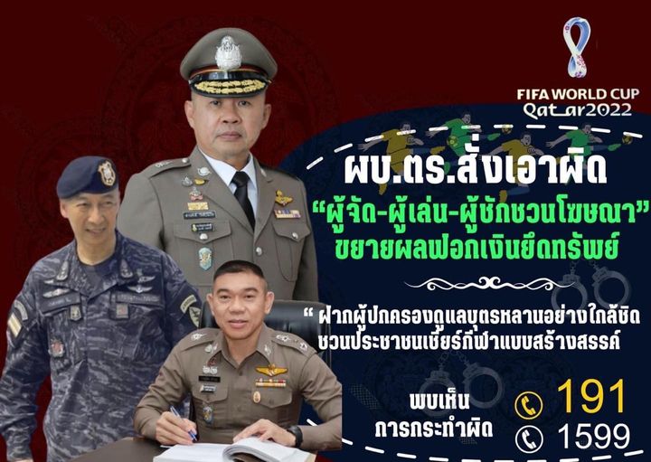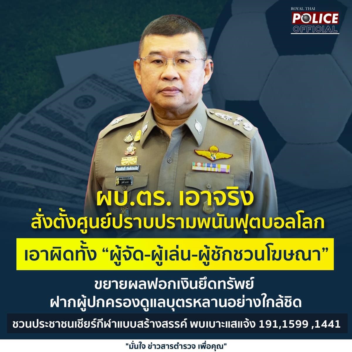 21 พ.ย. 2565 11:38:16ผบ.ตร. เอาจริง สั่งตั้งศูนย์ปราบปรามพนันฟุตบอลโลก เอาผิดทั้ง “ผู้จัด-ผู้เล่น-ผู้ชักชวนโฆษณา” ขยายผลฟอกเงินยึดทรัพย์ ฝากผู้ปกครองดูแลบุตรหลานอย่างใกล้ชิด ชวนประชาชนเชียร์กีฬาแบบสร้างสรรค์ พบเบาะแสแจ้ง 191, 1599,1441 . พล.ต.อ.ดำรงศักดิ์ กิตติประภัสร์ ผบ.ตร. กล่าวถึงมาตรการป้องกันปราบปรามการลักลอบเล่นพ...