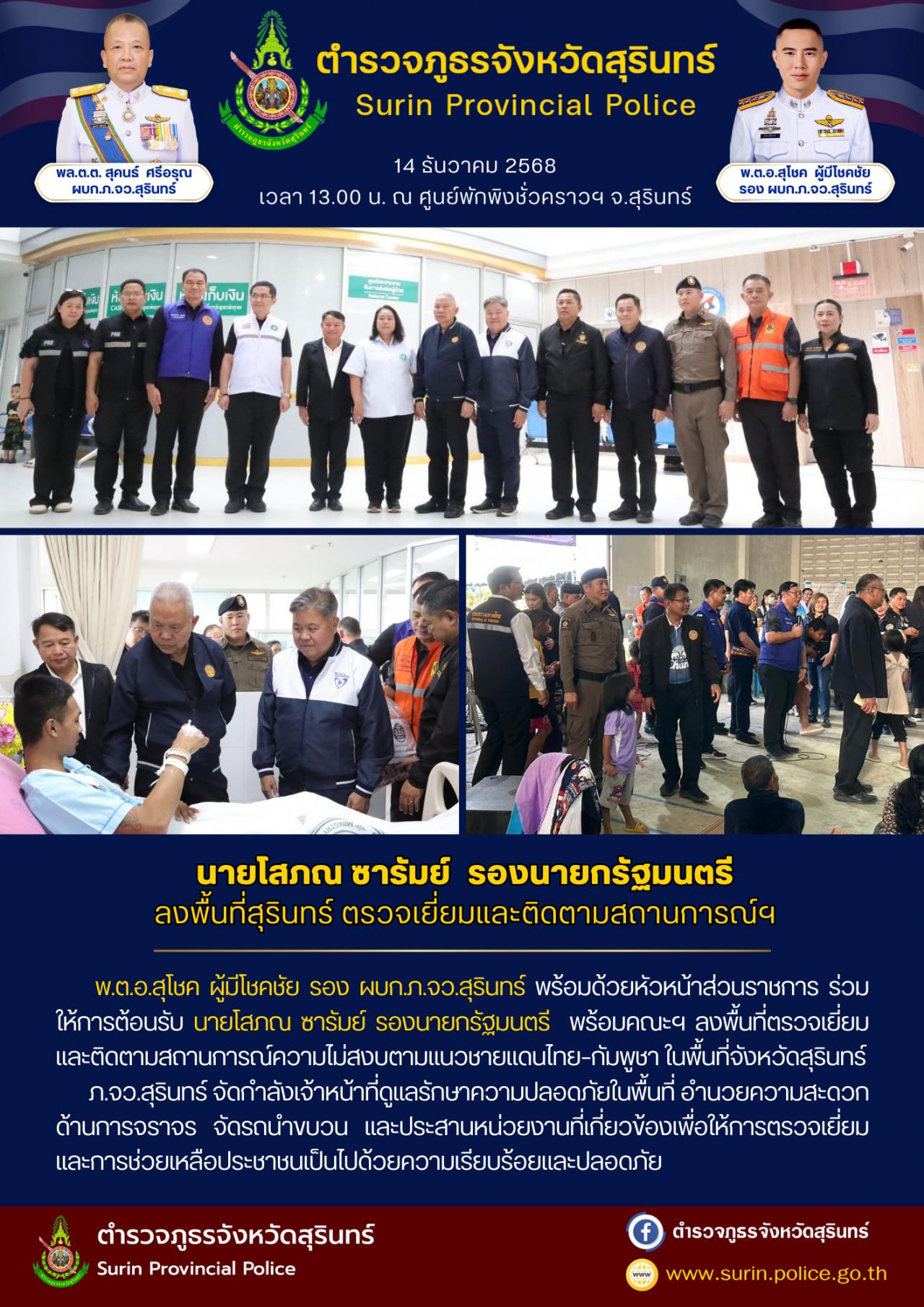 14 ธ.ค. 2568 20:29:48 วันนี้ 14 ธ.ค.68 เวลา 13.00 น. พ.ต.อ.สุโชค ผู้มีโชคชัย รอง ผบก.ภ.จว.สุรินทร์ และหัวหน้าส่วนราชการ ร่วมให้การต้อนรับ นายโสภณ ซารัมย์ รองนายกรัฐมนตรี พร้อมคณะ ได้เดินทางไปตรวจเยี่ยมศูนย์พักพิงในพื้นที่จังหวัดสุรินทร์ และได้มอบสิ่งของเพื่อเป็นขวัญกำลังใจให้แก่ผู้อพยพจากเหตุการณ์ปะทะในพื้นที่ชายแดนไทย...