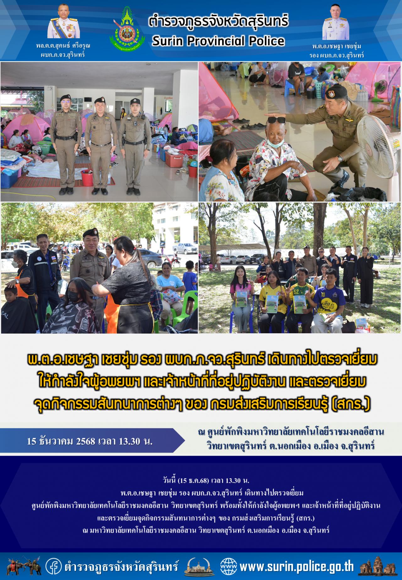 15 ธ.ค. 2568 18:52:35พ.ต.อ.เชษฐา เชยชุ่ม รอง ผบก.ภ.จว.สุรินทร์ เดินทางไปตรวจเยี่ยมให้กำลังใจผู้อพยพฯ เเละเจ้าหน้าที่ที่อยู่ปฏิบัติงาน เเละตรวจเยี่ยมจุดกิจกรรมสันทนาการต่างๆ ของ กรมส่งเสริมการเรียนรู้ (สกร.) วันนี้ (15 ธ.ค.68) เวลา 13.30 น. พ.ต.อ.เชษฐา เชยชุ่ม รอง ผบก.ภ.จว.สุรินทร์ เดินทางไปตรวจเยี่ยมศูนย์พักพิ...
