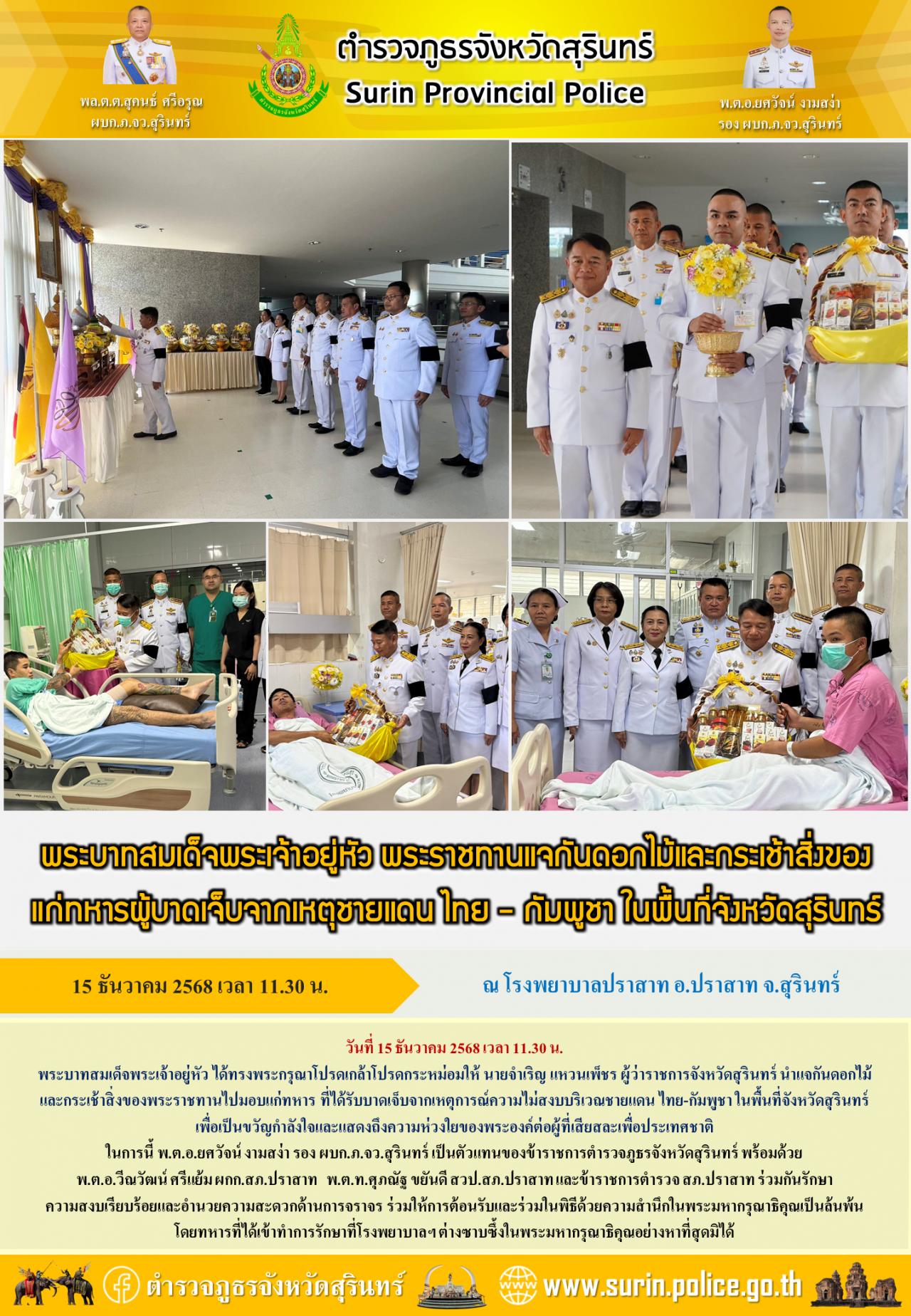 15 ธ.ค. 2568 18:52:45วันที่ 15 ธันวาคม 2568 เวลา 11.30 น. พระบาทสมเด็จพระเจ้าอยู่หัว ได้ทรงพระกรุณาโปรดเกล้าโปรดกระหม่อมให้ นายจำเริญ แหวนเพ็ชร ผู้ว่าราชการจังหวัดสุรินทร์ นำแจกันดอกไม้และกระเช้าสิ่งของพระราชทานไปมอบแก่ทหาร ที่ได้รับบาดเจ็บจากเหตุการณ์ความไม่สงบบริเวณชายแดน ไทย-กัมพูชา ในพื้นที่จังหวัดสุรินทร์ เพื่อเป...