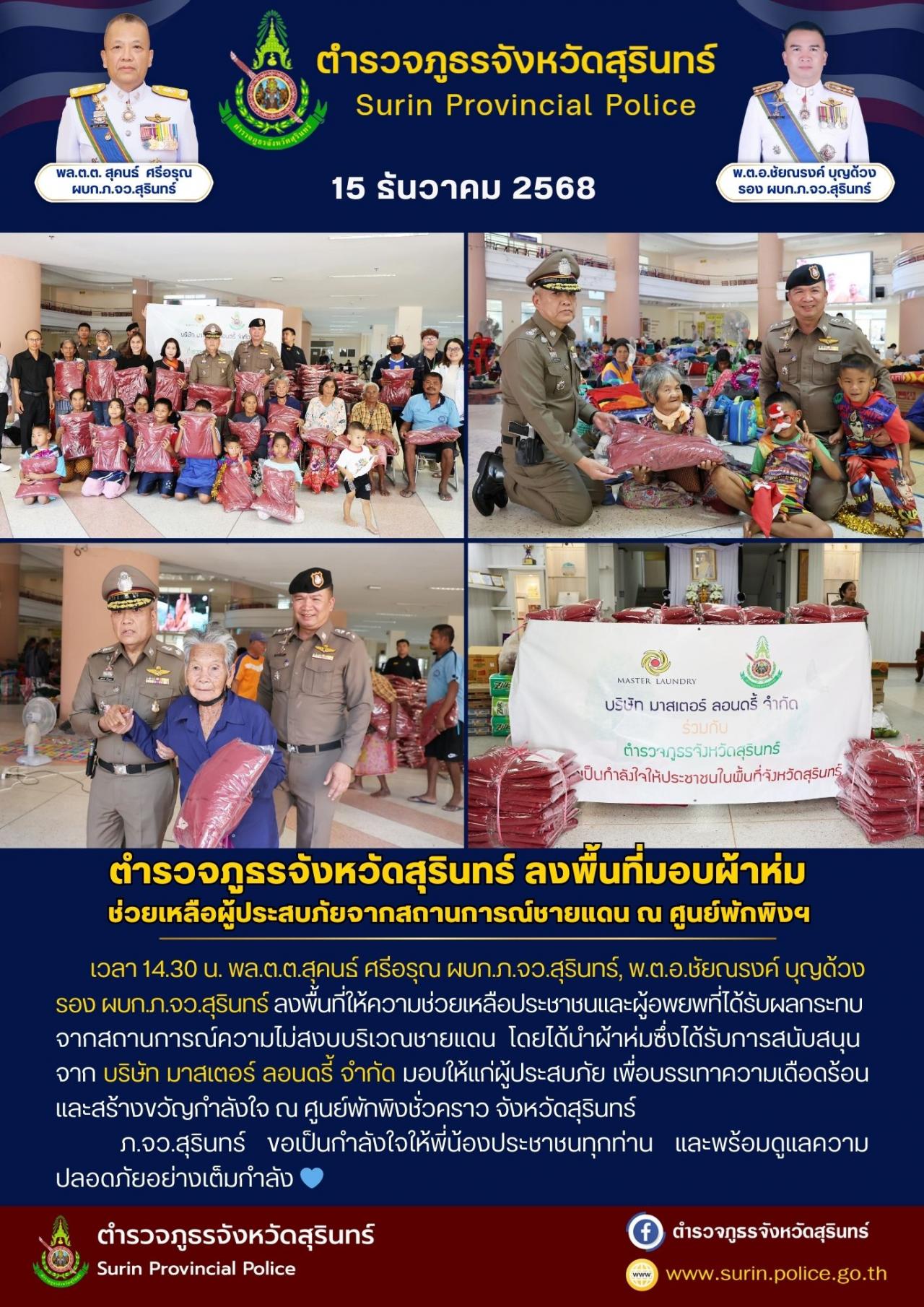 15 ธ.ค. 2568 18:56:05วันนี้ (15 ธ.ค. 68) เวลา 14.30 น. พล.ต.ต.สุคนธ์ ศรีอรุณ ผบก.ภ.จว.สุรินทร์ และ พ.ต.อ.ชัยณรงค์ บุญด้วง รอง ผบก.ภ.จว.สุรินทร์ ลงพื้นที่ให้ความช่วยเหลือประชาชน และผู้อพยพที่ได้รับผลกระทบจากสถานการณ์ความไม่สงบบริเวณชายแดน โดยได้นำผ้าห่มซึ่งได้รับการสนับสนุนจากบริษัท มาสเตอร์ ลอนดรี้ จำกัด มอบเพื่อบรรเทาค...