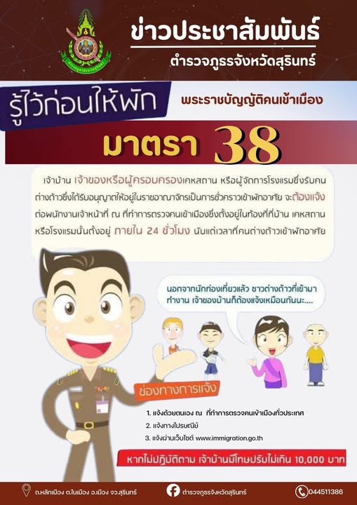 15 ธ.ค. 2568 19:00:51🛑รู้ไว้ ก่อนให้พัก🛑 พระราชบัญญัติคนเข้าเมือง พ.ศ. 2522 มาตรา 38 เจ้าบ้าน เจ้าของหรือผู้ครอบครองเคหสถาน หรือผู้จัดการโรงแรมซึ่งรับคน ต่างด้าวซึ่งได้รับอนุญาตให้อยู่ในราชอาณาจักรเป็นการชั่วคราวเข้าพักอาศัย จะต้องแจ้ง ต่อพนักงานเจ้าหน้าที่ ณ ที่ทำการตรวจคนเข้าเมืองซึ่งตั้งอยู่ในท้องที่ที่บ้าน เคหสถาน ห...