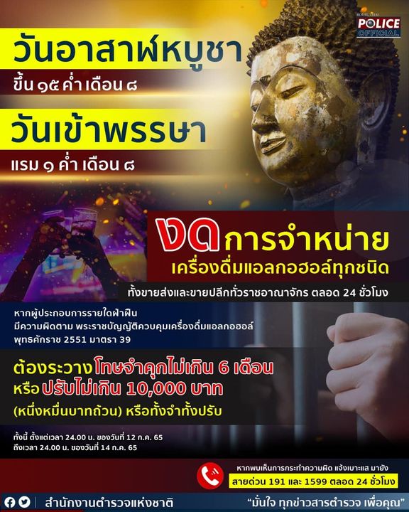 12 ก.ค. 2565 15:34:59สำนักงานตำรวจแห่งชาติ ประชาสัมพันธ์ห้ามจำหน่ายเครื่องดื่มแอลกอฮอล์ ในวันอาสาฬหบูชาและวันเข้าพรรษา ประจำปี 2565 พร้อมดูแลความปลอดภัยชีวิตและทรัพย์สิน รวมถึงการอำนวยความสะดวกการจราจรช่วงวันหยุดยาว 13 - 17 กรกฎาคม 2565 พล.ต.ต.หญิง วิชญ์ชยากร ณิชาบวร รองโฆษกสำนักงานตำรวจแห่งชาติ เปิดเผยว่า วันพุธที่ 13 ...