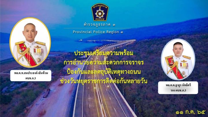 11 ก.ค. 2565 11:01:08ตำรวจภูธรภาค 3 เตรียมความพร้อมการอำนวยความสะดวกด้านการจราจรป้องกันและลดอุบัติเหตุทางถนนช่วงวันหยุดราชการติดต่อกันหลายวัน (13-17 ก.ค.65 และ 28-31 ก.ค.65) . วันนี้(11 ก.ค.65)เวลา 13.30น. พล.ต.ท.สมประสงค์ เย็นท้วม ผบช.ภ.3 มอบหมายให้ พล.ต.ต.ฐากูร นัทธีศรี รอง ผบช.ภ.3 พร้อมด้วย พ.ต.อ.ปฏิยุทธ สิงห์สมโรจน์...
