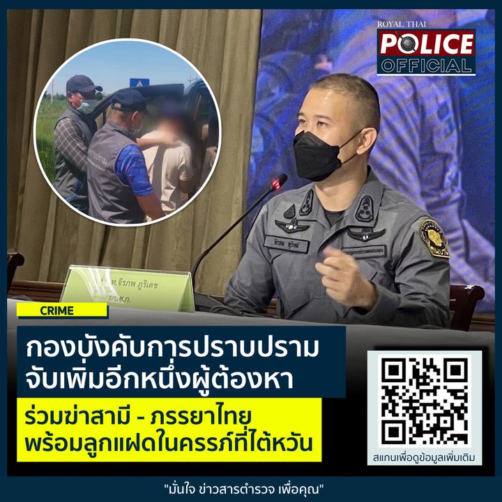 20 มิ.ย. 2565 02:43:00กองบังคับการปราบปราม จับเพิ่มอีกหนึ่งผู้ต้องหา ร่วมฆ่าสามี - ภรรยาไทยพร้อมลูกแฝดในครรภ์ที่ไต้หวัน ตำรวจกองปราบจับ "ธนวัฒน์ฯ" ผู้ต้องร่วมฆ่าสามี - ภรรยาไทยในไต้หวัน สารภาพร่วมก่อเหตุกับ "สันติ" ปมเหตุขัดแย้งธุรกิจในไต้หวัน ตำรวจเร่งติดตามตัว "สามารถ" ที่ยังหลบหนีอีกคน สัปดาห์หน้าส่งทีมกองปราบร่วมสืบ...