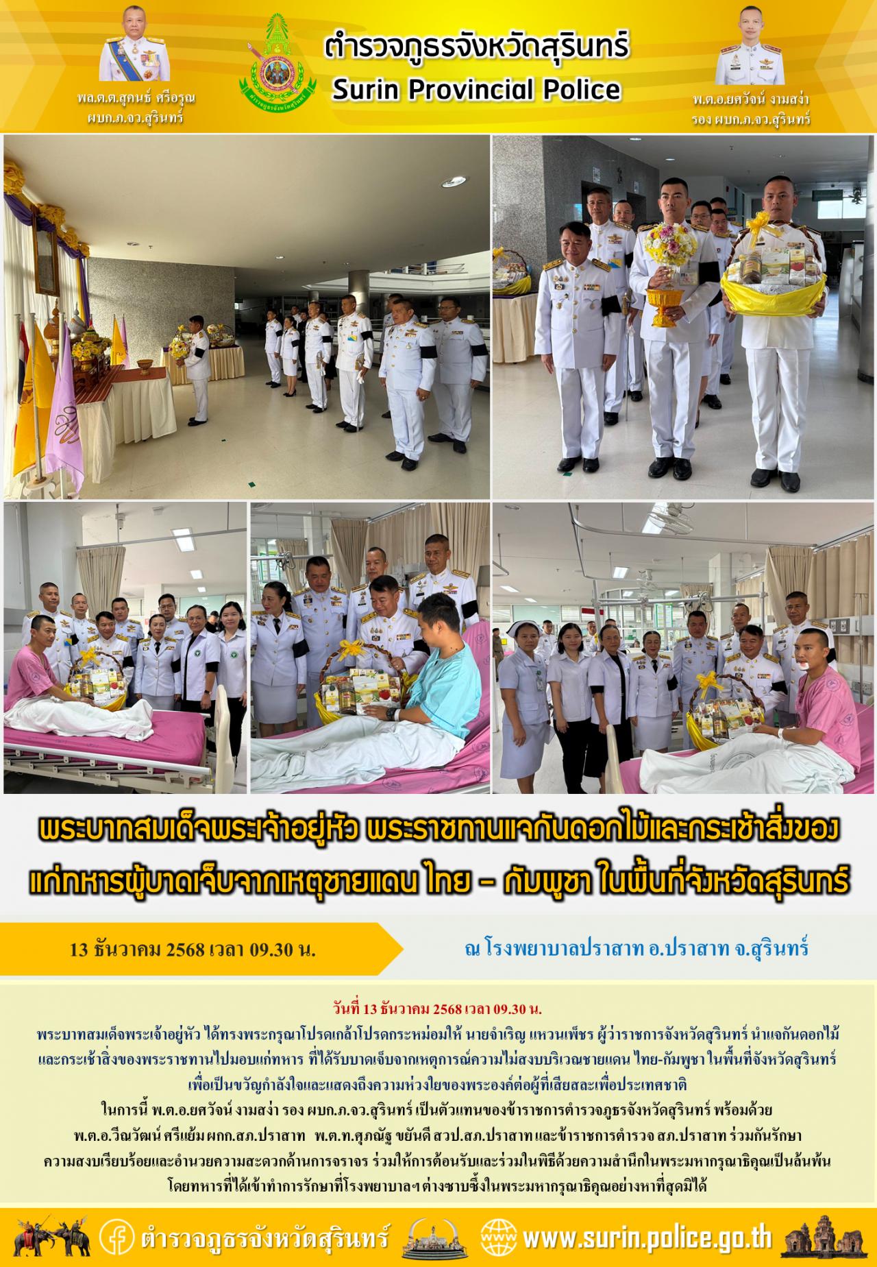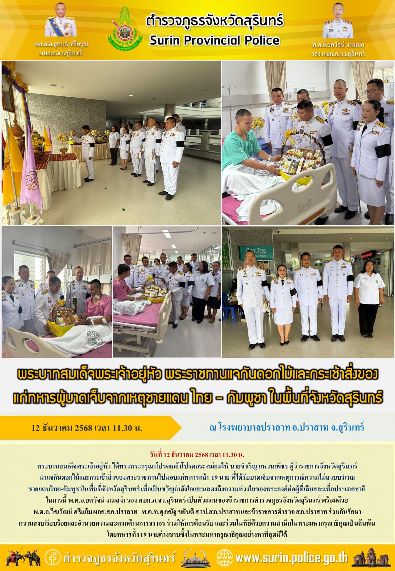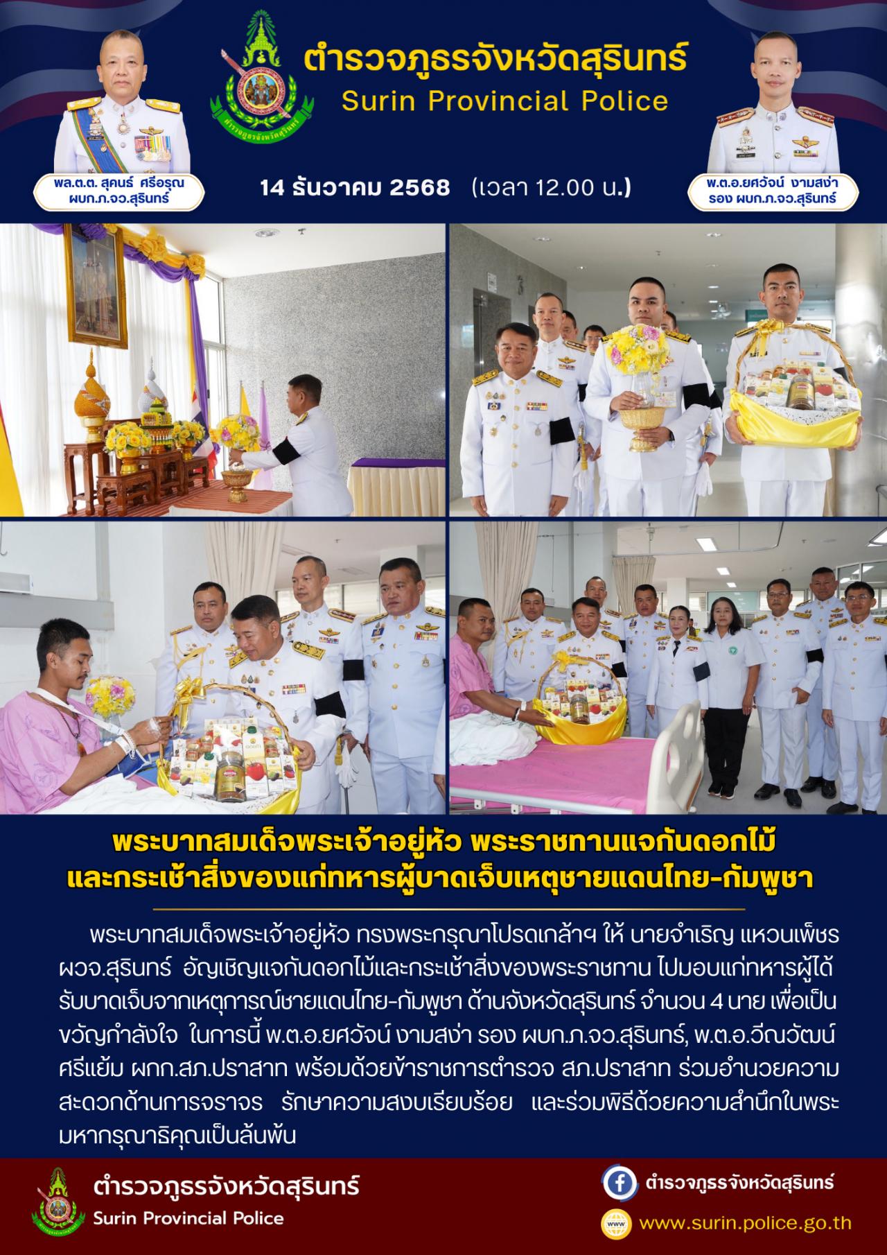 13 ธ.ค. 2568 16:04:31พระบาทสมเด็จพระเจ้าอยู่หัว พระราชทานแจกันดอกไม้และกระเช้าสิ่งของแก่ทหารผู้บาดเจ็บจากเหตุชายแดน ไทย - กัมพูชา ในพื้นที่จังหวัดสุรินทร์ วันที่ 13 ธันวาคม 2568 เวลา 09.30 น. พระบาทสมเด็จพระเจ้าอยู่หัว ได้ทรงพระกรุณาโปรดเกล้าโปรดกระหม่อมให้ นายจำเริญ แหวนเพ็ชร ผู้ว่าราชการจังหวัดสุรินทร์ นำแจกันดอกไม้...