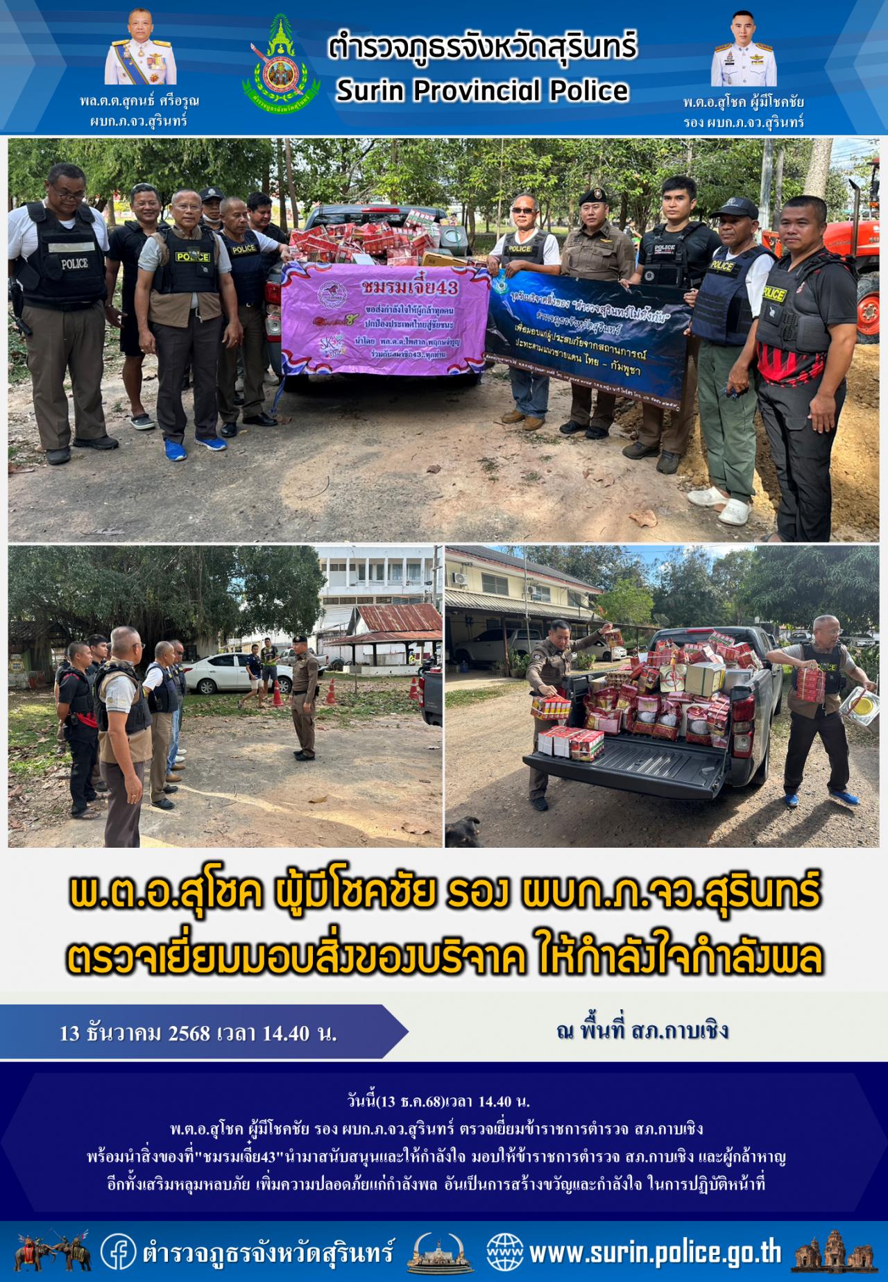 13 ธ.ค. 2568 16:43:45พ.ต.อ.สุโชค ผู้มีโชคชัย รอง ผบก.ภ.จว.สุรินทร์ ตรวจเยี่ยมมอบสิ่งของบริจาค ให้กำลังใจกำลังพล วันนี้(13 ธ.ค.68) เวลา 11.40 น. พ.ต.อ.สุโชค ผู้มีโชคชัย รอง ผบก.ภ.จว.สุรินทร์ ตรวจเยี่ยมมอบสิ่งของบริจาค ให้กำลังใจกำลังพล สภ.พนมดงรัก และ ภ.จว.สุรินทร์ พบ พ.ต.อ.นพดล พินิจอักษร ผกก.สภ.พนมดงรัก พ.ต.ท.วิชาญ...