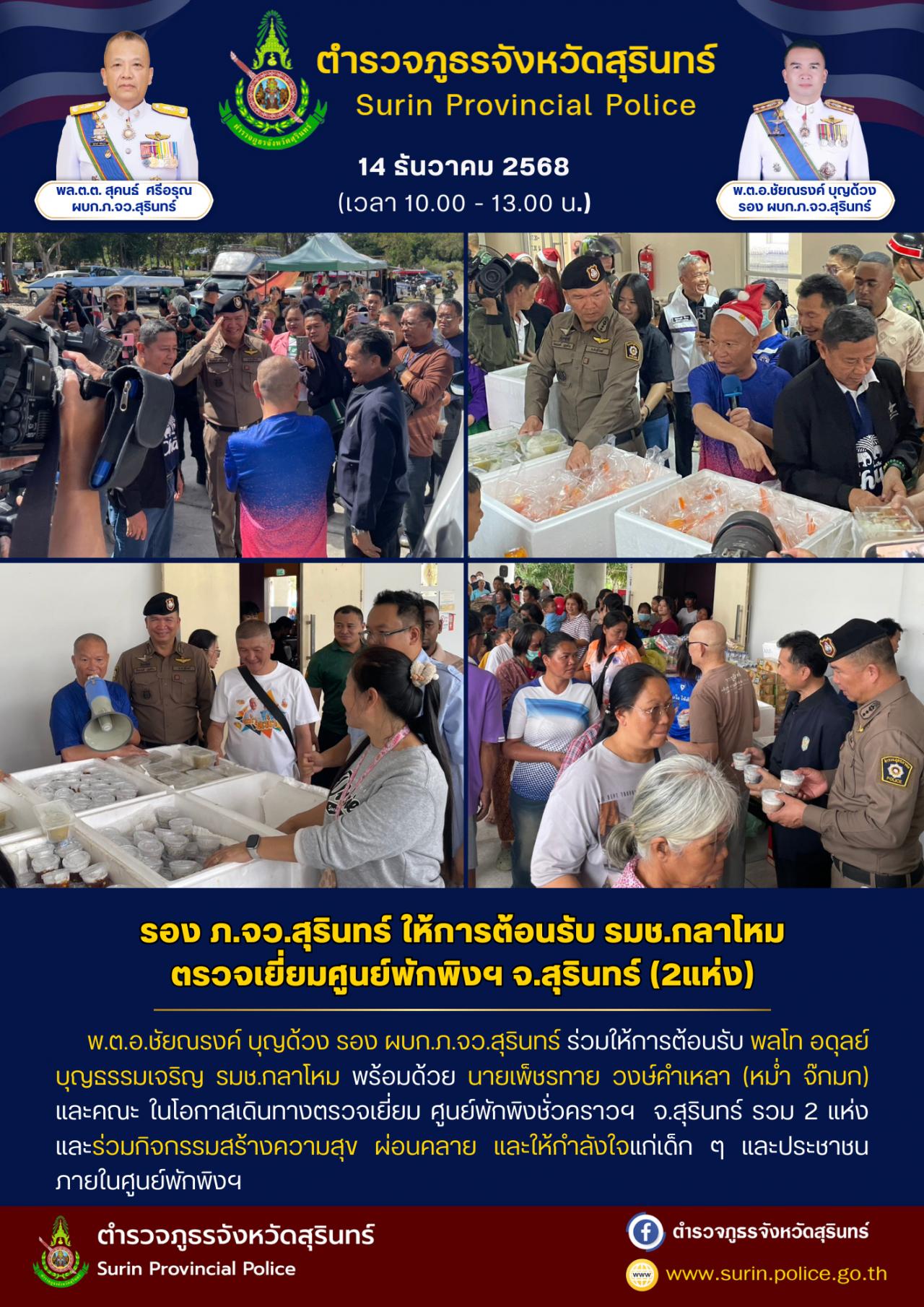 14 ธ.ค. 2568 20:29:36วันนี้ 14 ธ.ค.2568 เวลา เวลา 10.00 – 12.00 น. พ.ต.อ.ชัยณรงค์ บุญด้วง รอง ผบก.ภ.จว.สุรินทร์ ให้การต้อนรับ พลโท อดุลย์ บุญธรรมเจริญ รัฐมนตรีช่วยว่าการกระทรวงกลาโหม พร้อมด้วย นายเพ็ชรทาย วงษ์คำเหลา (หม่ำ จ๊กมก) และคณะ ได้เดินทางไปตรวจเยี่ยมศูนย์พักพิงฯ และร่วมทำกิจกรรมสร้างความสุข ความผ่อน...