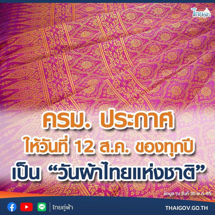 30 พ.ค. 2565 09:35:49ครม. ประกาศให้วันที่ 12 ส.ค. ของทุกปี เป็น “วันผ้าไทยแห่งชาติ” . ที่ประชุม ครม. (30 พ.ค. 65) เห็นชอบประกาศให้วันที่ 12 สิงหาคม ของทุกปี เป็นวันผ้าไทยแห่งชาติ เพื่อรณรงค์เผยแพร่ประชาสัมพันธ์ให้ทุกภาคส่วนได้น้อมสำนึกในพระมหากรุณาธิคุณของสมเด็จพระนางเจ้าสิริกิติ์ พระบรมราชินีนาถ พระบรมราชชนนีพันปีหลวง ...