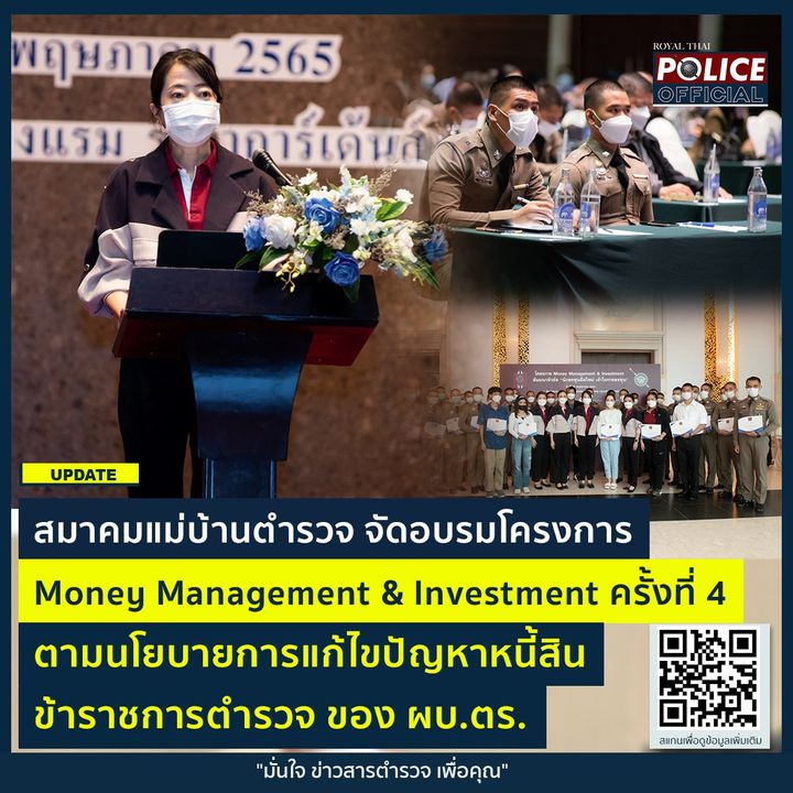 29 พ.ค. 2565 04:14:48สมาคมแม่บ้านตำรวจ จัดอบรมโครงการ Money Management & Investment ครั้งที่ 4 ตามนโยบายการแก้ไขปัญหาหนี้สินข้าราชการตำรวจ ของ ผบ.ตร. เมื่อวันที่ 28 พฤษภาคม 2565 เวลา 8.00 – 17.00 น. ณ ห้องคอนเวนชั่นเซ็นเตอร์ โรงแรมรามาการ์เด้นส์ ถ.วิภาวดี คุณรัตนาภรณ์ สีวลีพันธ์ นายกสมาคมแม่บ้านตำรวจ เป็นประธานในการเปิด...