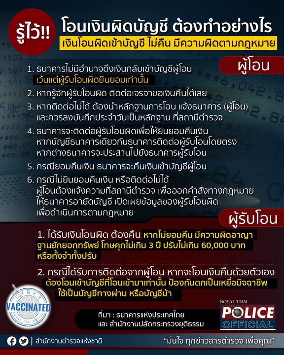 19 พ.ค. 2565 12:09:21รู้ไว้!! โอนเงินผิดบัญชี ต้องทำอย่างไร หากเงินโอนผิดเข้าบัญชี อย่าคิดว่าลาภลอย เงินใครไม่รู้เข้าบัญชี ยักยอกไว้ ไม่คืน มีความผิดตามกฎหมาย ผู้โอน 1.ธนาคารไม่มีอำนาจดึงเงินกลับเข้าบัญชีผู้โอน เว้นแต่ผู้รับโอนผิดยินยอมเท่านั้น 2.หากรู้จักผู้รับโอนผิด ติดต่อเจรจาขอเงินคืนได้เลย 3.หากติดต่อไม่ได้ ต้องนำห...