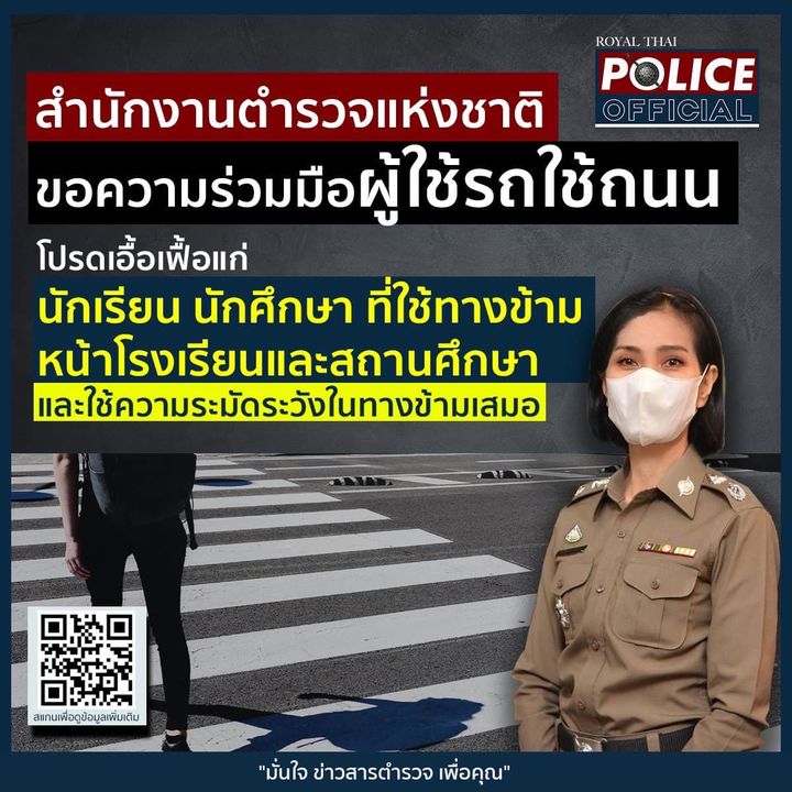 28 พ.ค. 2565 07:23:13สำนักงานตำรวจแห่งชาติขอความร่วมมือผู้ใช้รถใช้ถนนโปรดเอื้อเฟื้อแก่นักเรียน นักศึกษา ที่ใช้ทางข้ามหน้าโรงเรียนและสถานศึกษา และใช้ความระมัดระวังในทางข้ามเสมอ . วันที่ 27 พ.ค. 65 พล.ต.ต.หญิง วิชญ์ชยากร ณิชาบวร รองโฆษก สำนักงานตำรวจแห่งชาติ เปิดเผยว่า พ.ร.บ. จราจรทางบก พ.ศ.2522 ม.22 ผู้ขับขี่ต้องขั...