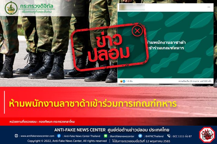 13 พ.ค. 2565 02:53:54ข่าวปลอม อย่าแชร์! ❌ ห้ามพนักงานลาซาด้าเข้าร่วมการเกณฑ์ทหาร . ตามที่มีการเผยแพร่ข้อมูลผ่านโซเชียลมีเดียเกี่ยวกับประเด็นห้ามพนักงานลาซาด้าเข้าร่วมการเกณฑ์ทหาร ทางศูนย์ต่อต้านข่าวปลอมได้ดำเนินการตรวจสอบข้อเท็จจริงโดยกองทัพบก กระทรวงกลาโหม พบว่าประเด็นดังกล่าวนั้น เป็นข้อมูลเท็จ...