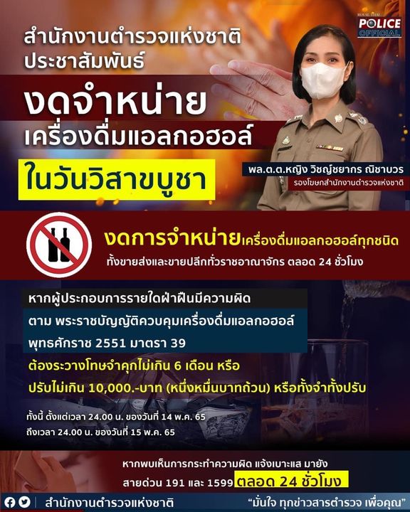 14 พ.ค. 2565 09:40:20สำนักงานตำรวจแห่งชาติ ประชาสัมพันธ์งดจำหน่ายเครื่องดื่มแอลกอฮอล์ในวันวิสาขบูชา เมื่อวันที่ 14 พฤษภาคม 2565 พล.ต.ต.หญิง วิชญ์ชยากร ณิชาบวร รองโฆษกสำนักงานตำรวจแห่งชาติ (ตร.) เปิดเผยว่า ตามที่มีประกาศสำนักนายกรัฐมนตรี เรื่อง กำหนดวันห้ามขายเครื่องดื่มแอลกอฮอล์ (ฉบับที่ 3) พ.ศ. 2558 ลงวันที่ 5 กุมภาพัน...