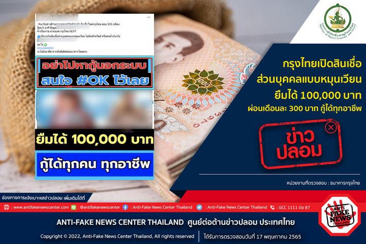 18 พ.ค. 2565 05:07:17ข่าวปลอม อย่าแชร์! ❌ กรุงไทยเปิดสินเชื่อส่วนบุคคลแบบหมุนเวียน ยืมได้ 100,000 บาท ผ่อนเดือนละ 300 บาท กู้ได้ทุกอาชีพ . ตามที่มีการเผยแพร่ข้อมูลในสื่อออนไลน์ประเด็นที่ว่ากรุงไทยเปิดสินเชื่อส่วนบุคคลแบบหมุนเวียน ยืมได้ 100,000 บาท ผ่อนเดือนละ 300 บาท กู้ได้ทุกอาชีพ ทางศูนย์ต่อต้านข่าวปลอมได้ดำเนินการต...