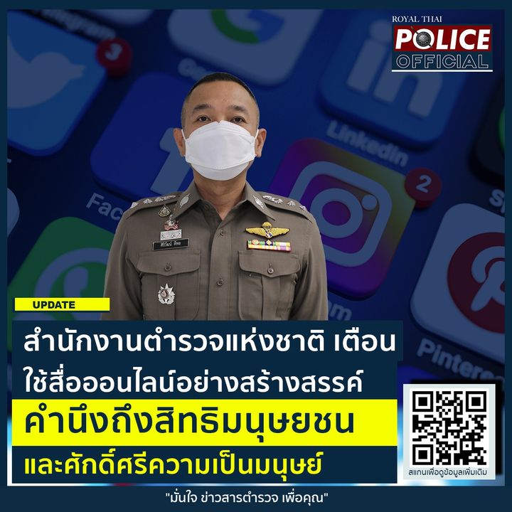 11 พ.ค. 2565 14:14:33สำนักงานตำรวจแห่งชาติ เตือน ใช้สื่อออนไลน์อย่างสร้างสรรค์ คำนึงถึงสิทธิมนุษยชน และศักดิ์ศรีความเป็นมนุษย์ วันที่ 11 พฤษภาคม 2565 พ.ต.อ.ศิริวัฒน์ ดีพอ รองโฆษกสำนักงานตำรวจแห่งชาติ (ตร.) กล่าวว่า ในช่วงที่ผ่านมา สำนักงานตำรวจแห่งชาติ พบว่ามีการเผยแพร่ข้อมูลในลักษณะที่กระทบต่อสิทธิมนุษยชน และศักดิ์ศรีค...