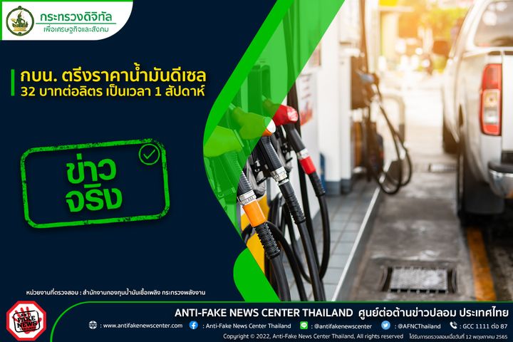 13 พ.ค. 2565 02:16:22กบน. ตรึงราคาน้ำมันดีเซล 32 บาทต่อลิตร เป็นเวลา 1 สัปดาห์ จริงหรือ? . ตามที่มีการเผยแพร่ข่าวสารถึงเรื่องกบน. ตรึงราคาน้ำมันดีเซล 32 บาทต่อลิตร เป็นเวลา 1 สัปดาห์ ทางศูนย์ต่อต้านข่าวปลอมได้ดำเนินการตรวจสอบข้อเท็จจริงโดยสำนักงานนโยบายและแผนพลังงาน กระทรวงพลังงาน พบว่าประเด็นดังกล่าวนั้น เป็นข้อมูลจริง...