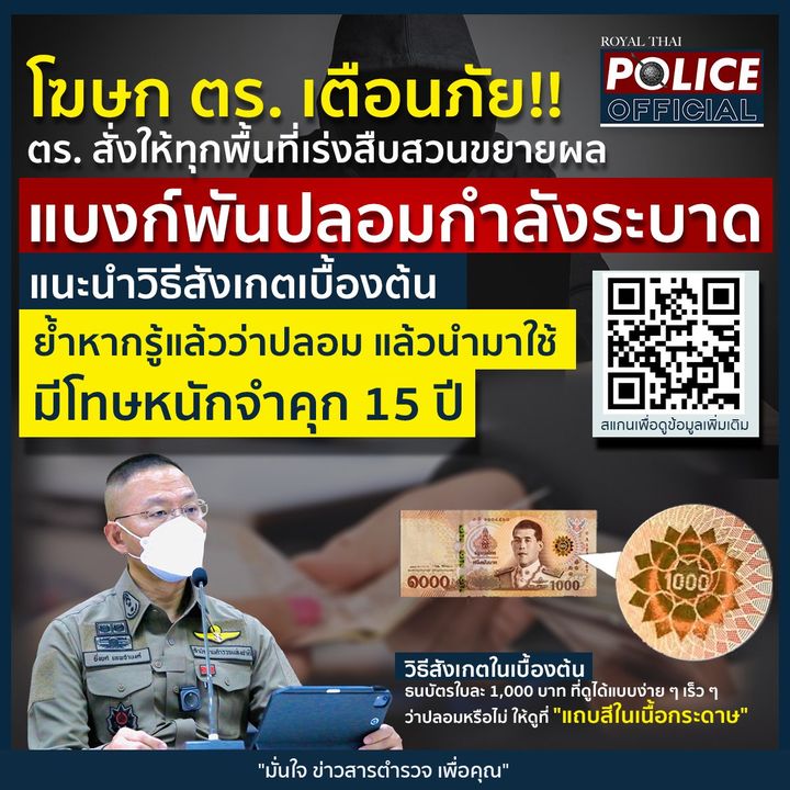 3 พ.ค. 2565 08:40:35โฆษก ตร. เตือนภัย!! ตร. สั่งให้ทุกพื้นที่เร่งสืบสวนขยายผล แบงก์พันปลอมกำลังระบาด แนะนำวิธีสังเกตเบื้องต้น ย้ำหากรู้แล้วว่าปลอม แล้วนำมาใช้ มีโทษหนักจำคุก 15 ปี เมื่อวันที่ 3 พ.ค. 65 ที่สำนักงานตำรวจแห่งชาติ (ตร.) พล.ต.ต.ยิ่งยศ เทพจำนงค์ โฆษก ตร. ได้กล่าวถึงปรากฏในสื่อต่าง ๆ ถึงกรณีพบว่ามีธนบัตรชนิด ...