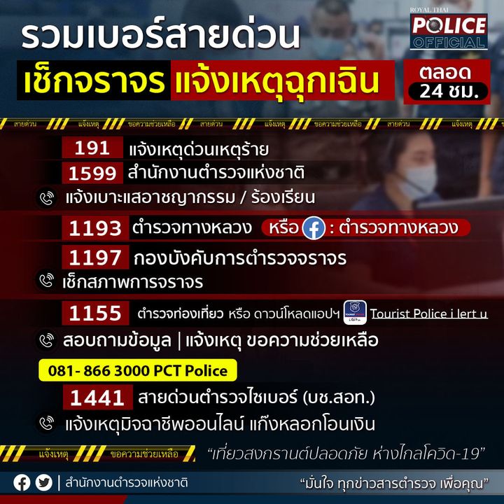 12 เม.ย. 2565 06:04:52เซฟเก็บไว้เลย!! รวมเบอร์สายด่วน . เช็กสภาพจราจร แจ้งเหตุฉุกเฉิน . 191 แจ้งเหตุด่วนเหตุร้าย 1599 สายด่วนสำนักงานตำรวจแห่งชาติ - แจ้งเบาะแสอาชญากรรม / ร้องเรียน 1193 ตำรวจทางหลวง หรือ เฟซบุ๊ก : ตำรวจทางหลวง - เช็กสภาพการจราจร 1197 กองบังคับการตำรวจจราจร - เช็กสภาพจราจร 1155 ตำรวจท่องเที่ยว หรือดาว...
