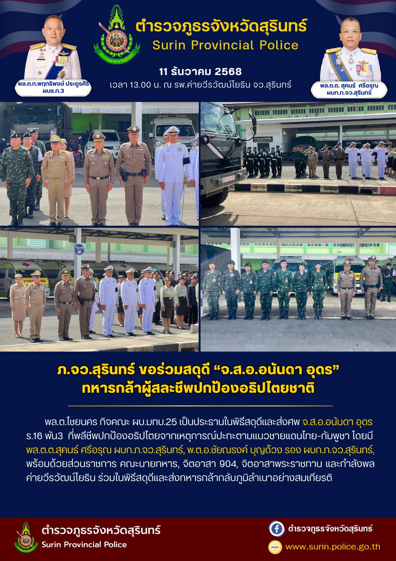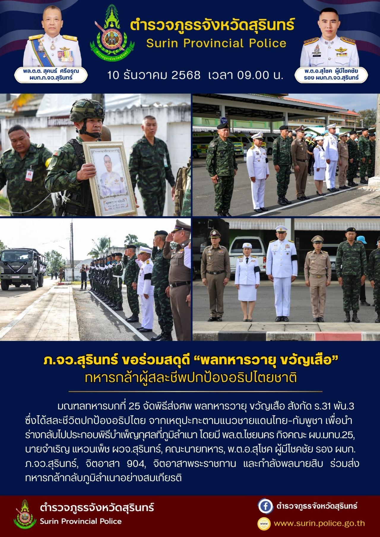 11 ธ.ค. 2568 23:05:07ผบก.ภ.จว.สุรินทร์ ร่วมพิธีสดุดีและส่งศพ จ.ส.อ.อนันดา อุดร กำลังพล ร.16 พัน3 และ พลทหารธนกร สิงหาชาติ ที่พลีชีพปกป้องอธิปไตยจากเหตุการณ์ปะทะตามแนวชายแดนไทย-กัมพูชา วันนี้ (11 ธ.ค. 68) เวลา 13.00 น. พล.ต.ต.สุคนธ์ ศรีอรุณ ผบก.ภ.จว.สุรินทร์, พ.ต.อ.ชัยณรงค์ บุญด้วง รอง ผบก.ภ.จว.สุรินทร์, พร้อมด้วยส่วนรา...