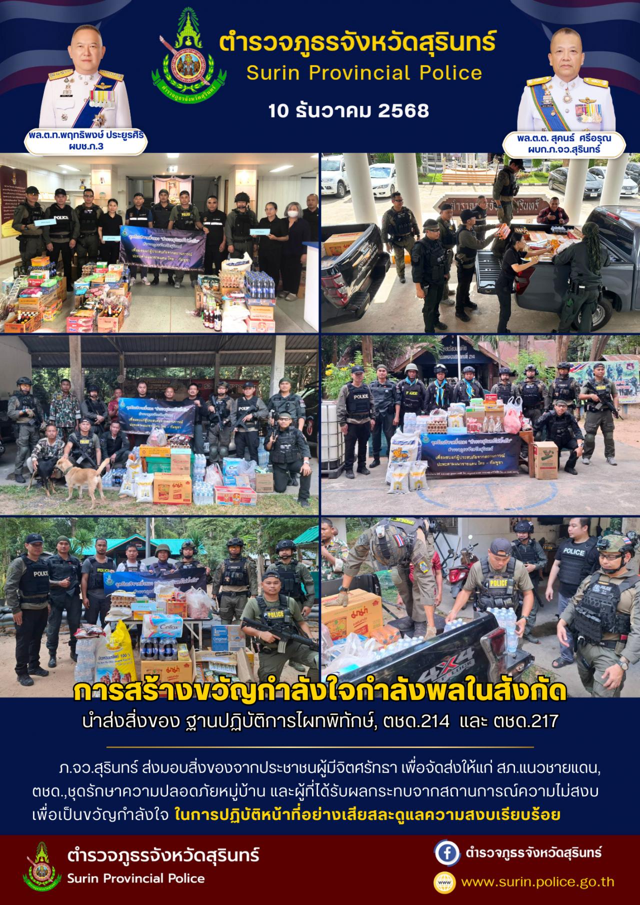 10 ธ.ค. 2568 20:15:32พ.ต.อ.ชัยณรงค์ บุญด้วง รอง ผบก.ภ.จว.สุรินทร์ ตรวจเยี่ยมกำลังพล–มอบกำลังใจศูนย์พักพิง วันพุธที่ 10 ธ.ค. 2568 เวลา 09.45 น. พ.ต.อ.ชัยณรงค์ บุญด้วง รอง ผบก.ภ.จว.สุรินทร์ ตรวจเยี่ยม สภ.เทนมีย์ มอบสิ่งของสนับสนุน “โรงครัว สภ.เทนมีย์” และให้กำลังใจกำลังพลที่เตรียมพร้อม 100% ณ ที่ตั้ง กำชับชุดสืบสวนและสายต...