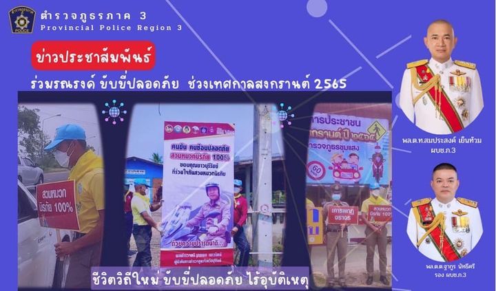 10 เม.ย. 2565 09:53:45การอำนวยความสะดวกการจราจร ป้องกันและลดอุบัติเหตุทางถนน ช่วงเทศกาลสงกรานต์ พ.ศ.2565 ของตำรวจภูธรภาค 3 . พลตำรวจโท สมประสงค์ เย็นท้วม ผู้บัญชาการตำรวจภูธรภาค 3 พร้อมด้วย พลตำรวจตรี ฐากูร นัทธีศรี รองผู้บัญชาการตำรวจภูธรภาค 3 ซึ่งรับผิดชอบงานจราจร ได้บูรณาการเตรียมความพร้อมการอำนวยความสะดวกจราจร ป...